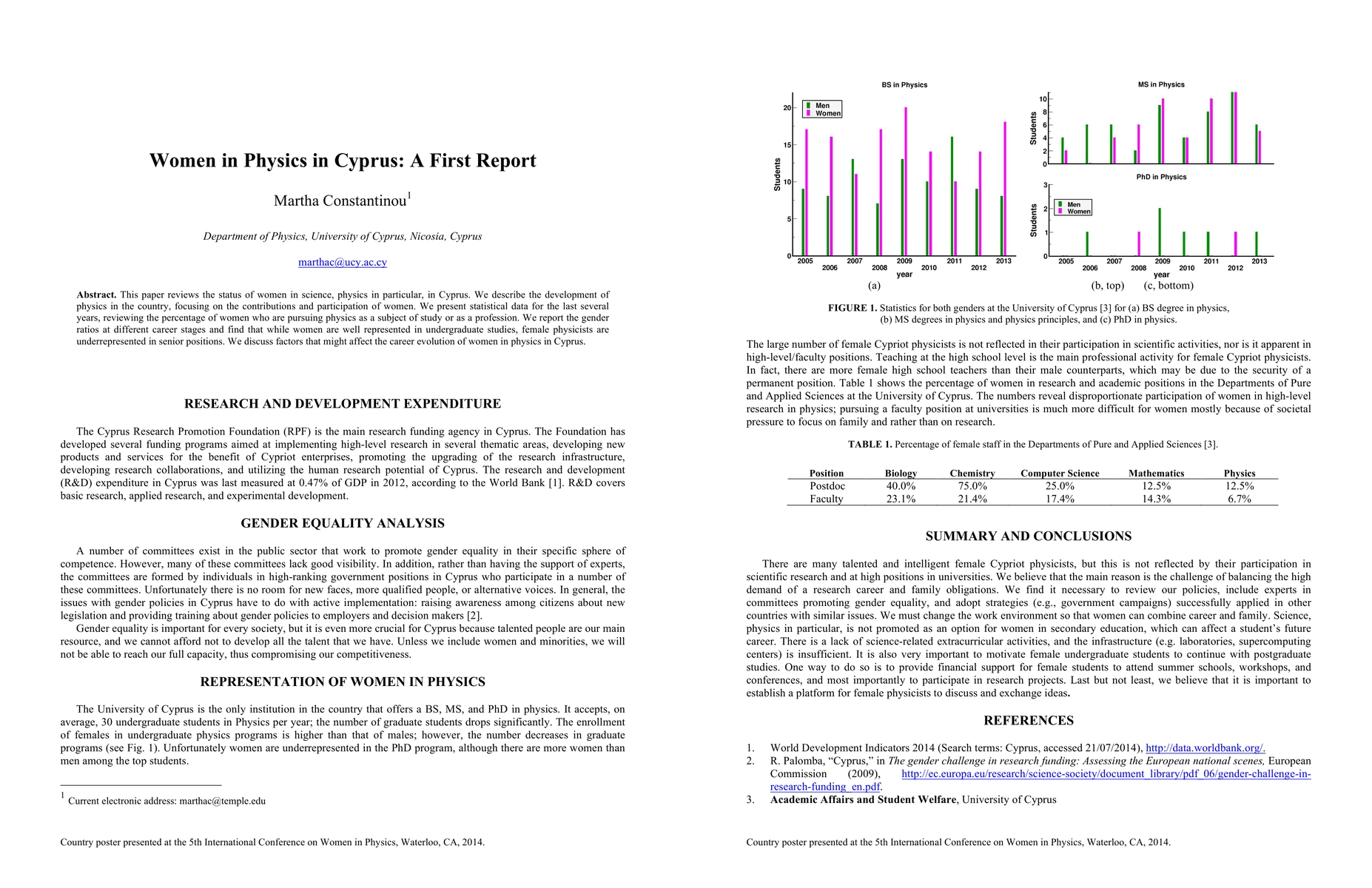 This paper examines the status of women in physics in Cyprus, highlighting their participation and contributions, and noting that while women are well represented in undergraduate studies, they are underrepresented in senior positions. Factors influencing their career progression are also discussed.