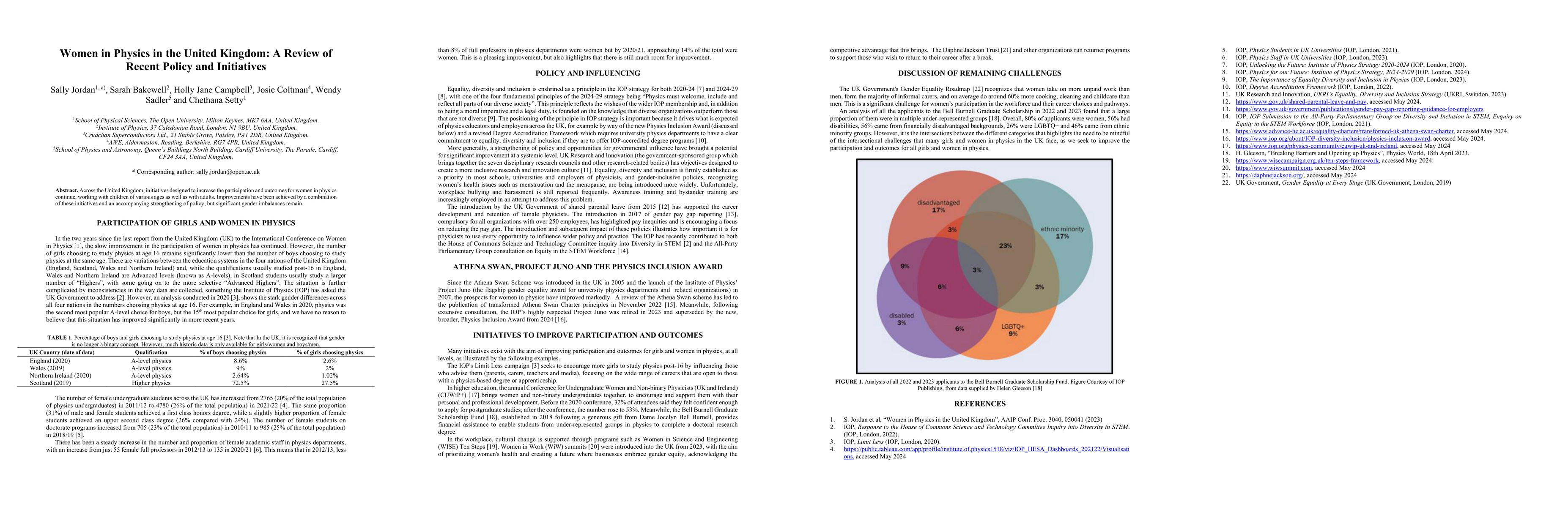 Across the United Kingdom, initiatives designed to increase the participation and outcomes for women in physics continue, working with children of various ages as well as with adults. Improvements have been achieved by a combination of these initiatives and an accompanying strengthening of policy, but significant gender imbalances remain.