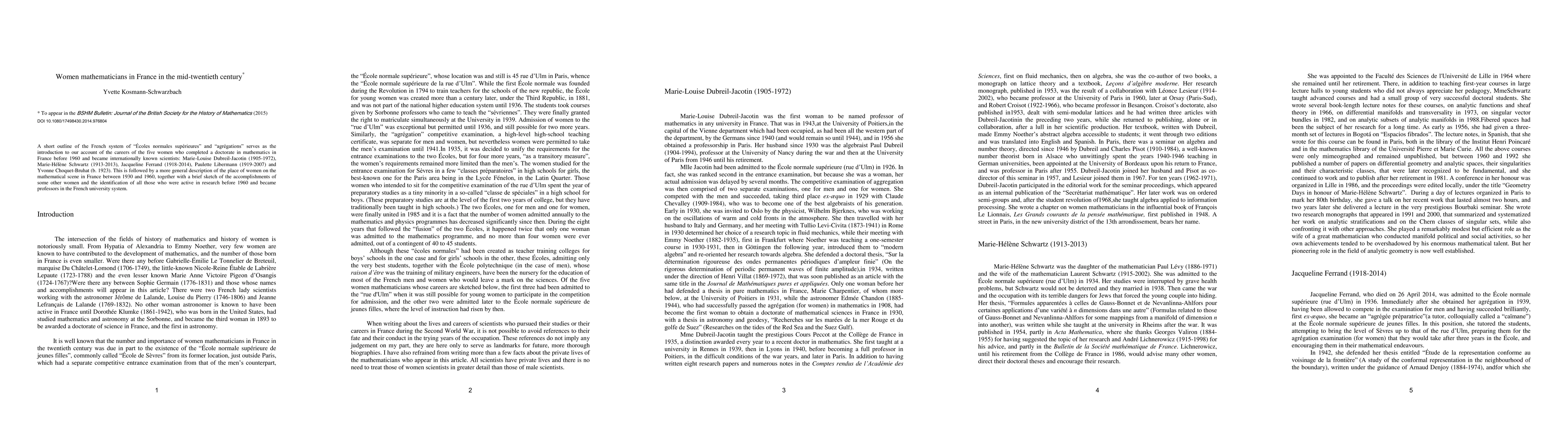 An account of the careers of the five women who completed a doctorate in mathematics in France before 1960 and became internationally known scientists, followed by a more general description of the place of women on the mathematical scene in France between 1930 and 1960.