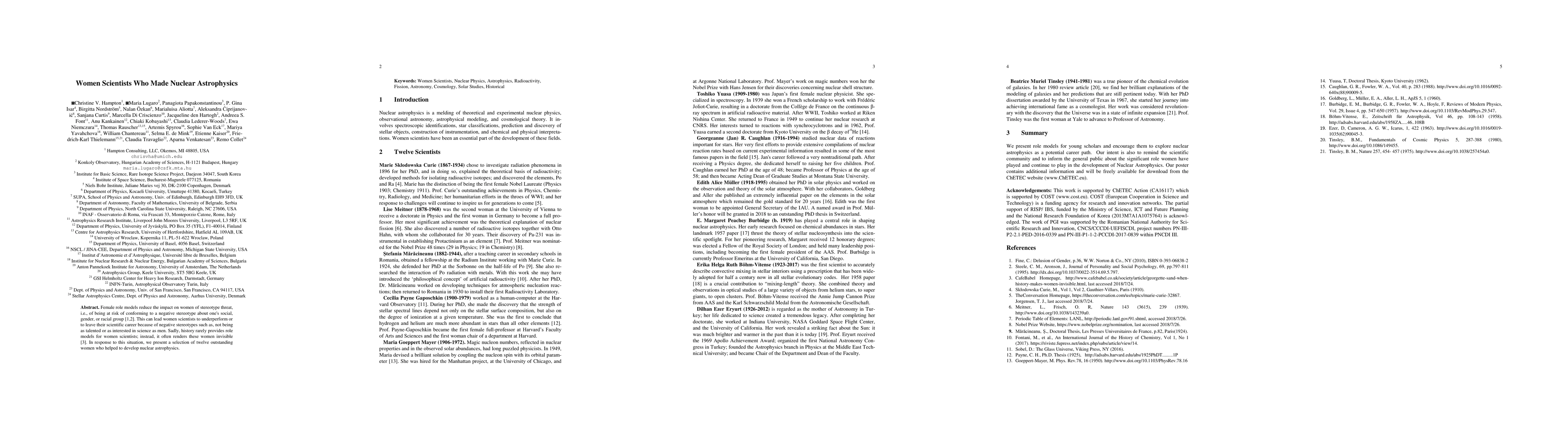 Female role models reduce the impact on women of stereotype threat, i.e., of being at risk of conforming to a negative stereotype about one's social, gender, or racial group. This can lead women scientists to underperform or to leave their scientific career because of negative stereotypes such as, not being as talented or as interested in science as men. Sadly, history rarely provides role models for women scientists; instead, it often renders these women invisible. In response to this situation, we present a selection of twelve outstanding women who helped to develop nuclear astrophysics.