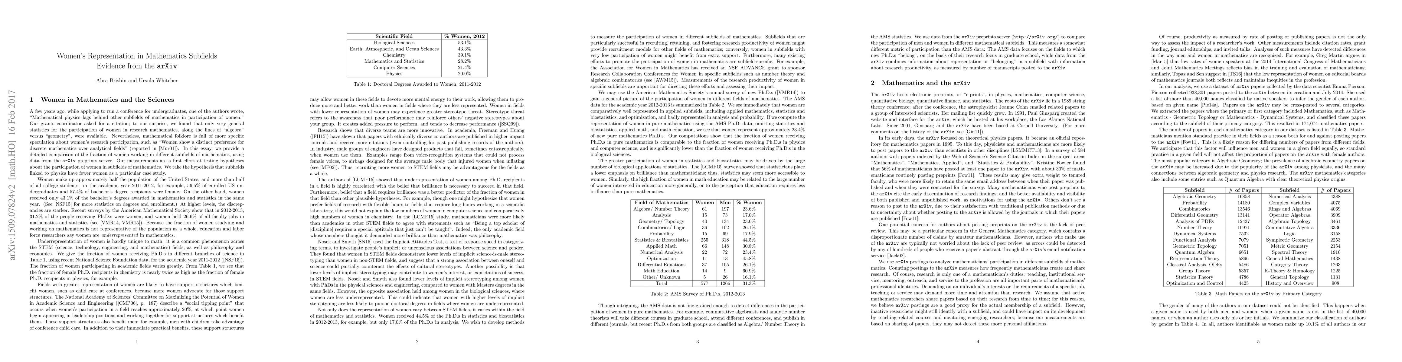 We use data from papers posted to the Mathematics section of the arXiv to explore the representation of women in mathematics research. We show that women are under-represented as authors of mathematics papers on the arXiv, even in comparison to the proportion of women who hold full-time positions in mathematics departments. However, some subfields have much greater participation than others.