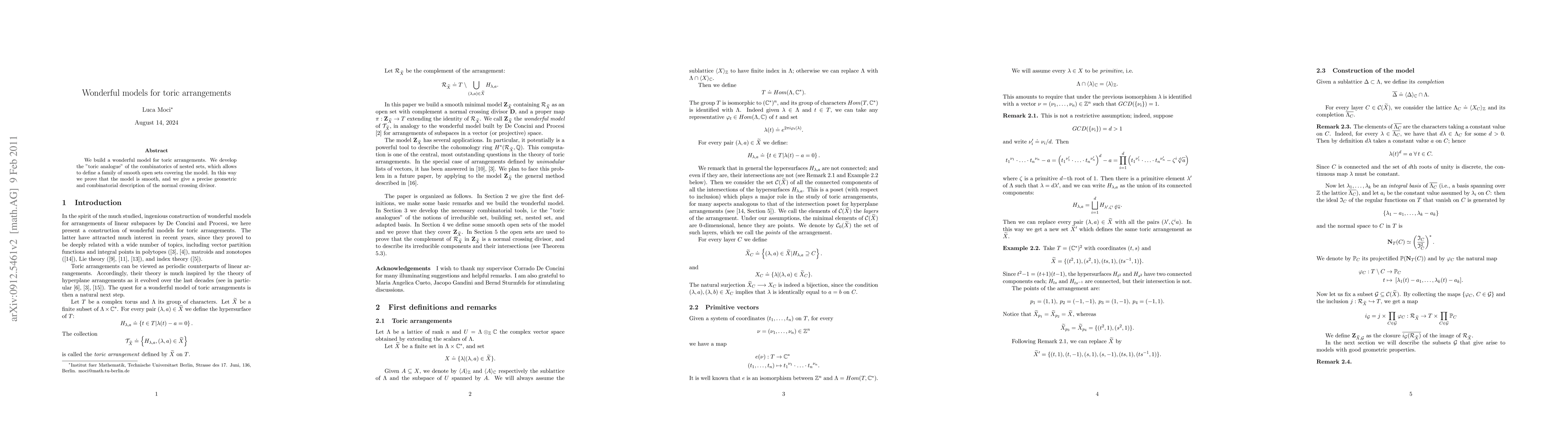 We build a wonderful model for toric arrangements. We develop the "toric analog" of the combinatorics of nested sets, which allows to define a family of smooth open sets covering the model. In this way we prove that the model is smooth, and we give a precise geometric and combinatorial description of the normal crossing divisor.