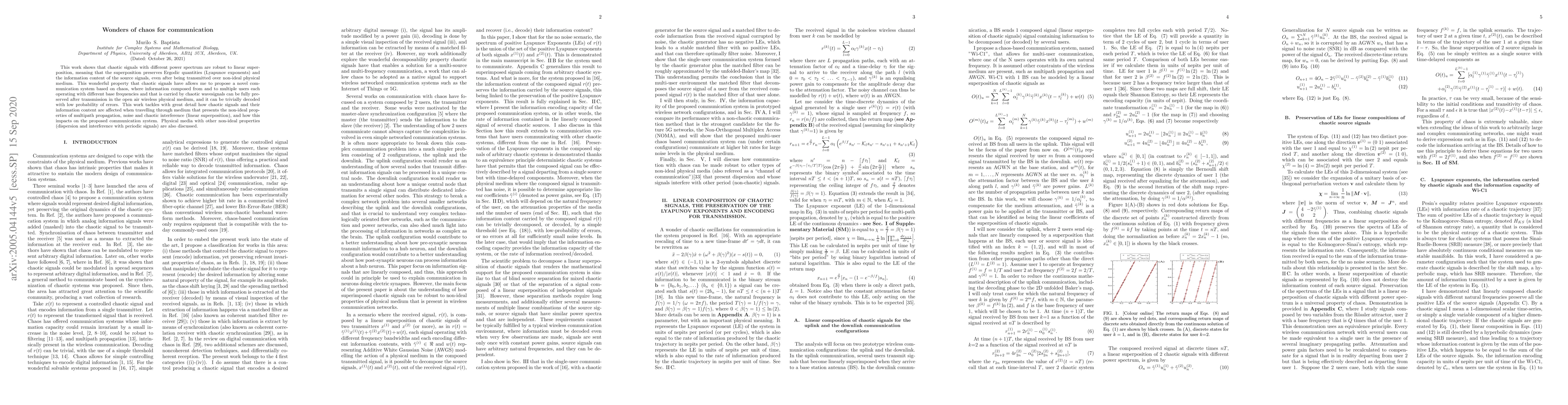 This work shows that chaotic signals with different power spectrum are robust to linear superposition, meaning that the superposition preserves Ergodic quantities (Lyapunov exponents) and the information content of the source signals, even after being transmitted over non-ideal physical medium. This wonderful property that chaotic signals have allows me to propose a novel communication system based on chaos, where information composed from and to multiple users each operating with different base frequencies and that is carried by chaotic wavesignals can be fully preserved after transmission in the open air wireless physical medium, and it can be trivially decoded with low probability of errors. This work tackles with great detail how chaotic signals and their information content are affected when travelling through medium that presents the non-ideal properties of multipath propagation, noise and chaotic interference (linear superposition), and how this impacts on the proposed communication system. Physical media with other non-ideal properties (dispersion and interference with periodic signals) are also discussed.