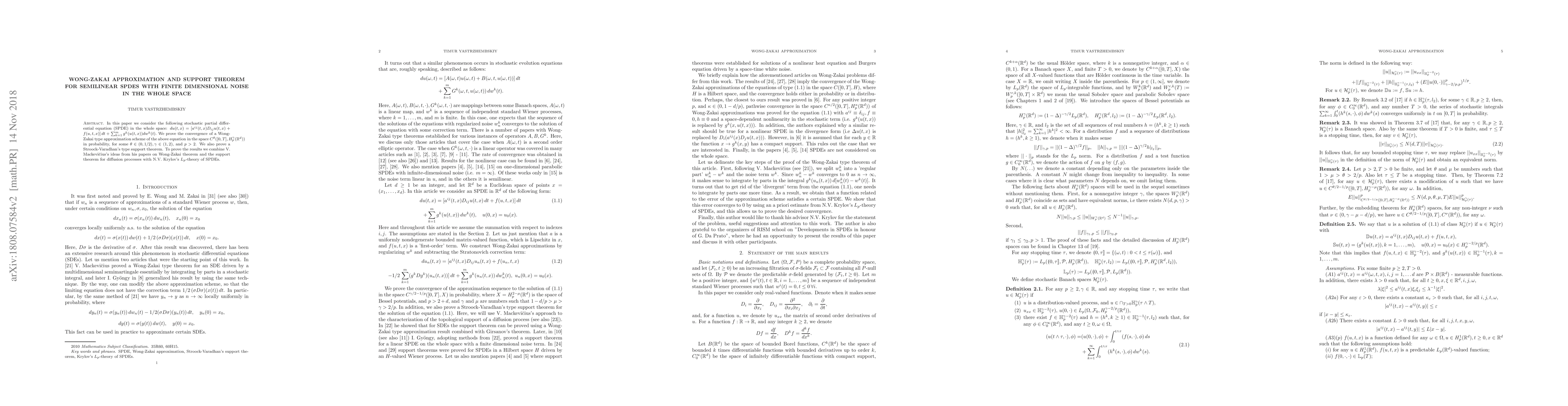 In this paper we consider the following stochastic partial differential equation (SPDE) in the whole space: $du (t, x) = [a^{i j} (t, x) D_{i j} u(t, x) + f(u, t, x)]\, dt + \sum_{k = 1}^m g^k (u(t, x)) dw^k (t).$ We prove the convergence of a Wong-Zakai type approximation scheme of the above equation in the space $ C^{\theta } ([0, T], H^{\gamma}_p (\mathbb{R}^d)) $ in probability, for some $ \theta \in (0,1/2), \gamma \in (1, 2)$, and $p > 2$. We also prove a Stroock-Varadhan's type support theorem. To prove the results we combine V. Mackevicius ideas from his papers on Wong-Zakai theorem and the support theorem for diffusion processes with N.V. Krylov's $L_p$-theory of SPDEs.