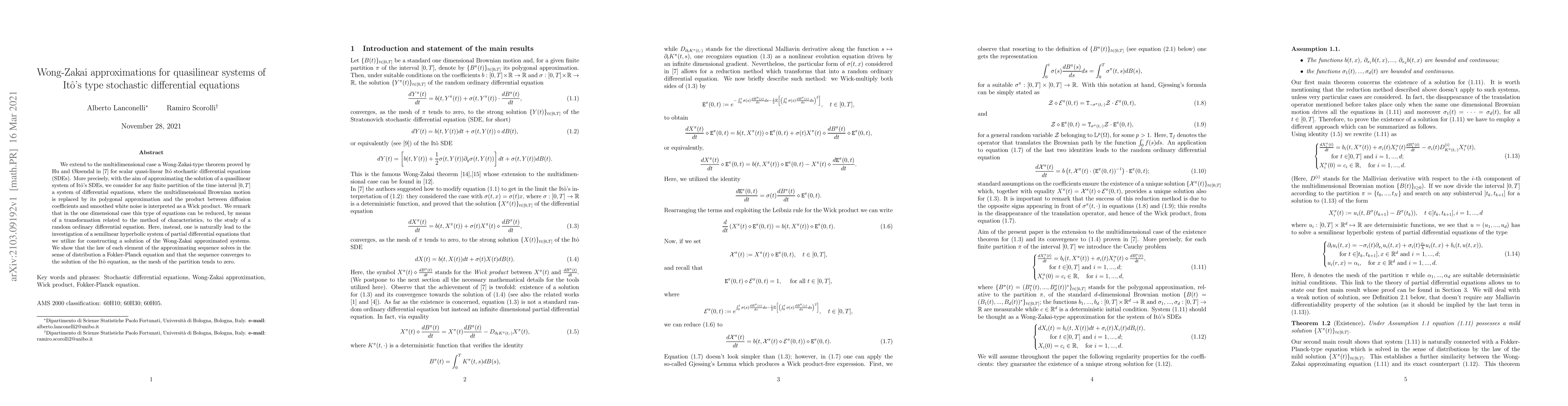 We extend to the multidimensional case a Wong-Zakai-type theorem proved by Hu and {\O}ksendal in [7] for scalar quasi-linear It\^o stochastic differential equations (SDEs). More precisely, with the aim of approximating the solution of a quasilinear system of It\^o's SDEs, we consider for any finite partition of the time interval $[0,T]$ a system of differential equations, where the multidimensional Brownian motion is replaced by its polygonal approximation and the product between diffusion coefficients and smoothed white noise is interpreted as a Wick product. We remark that in the one dimensional case this type of equations can be reduced, by means of a transformation related to the method of characteristics, to the study of a random ordinary differential equation. Here, instead, one is naturally lead to the investigation of a semilinear hyperbolic system of partial differential equations that we utilize for constructing a solution of the Wong-Zakai approximated systems. We show that the law of each element of the approximating sequence solves in the sense of distribution a Fokker-Planck equation and that the sequence converges to the solution of the It\^o equation, as the mesh of the partition tends to zero.