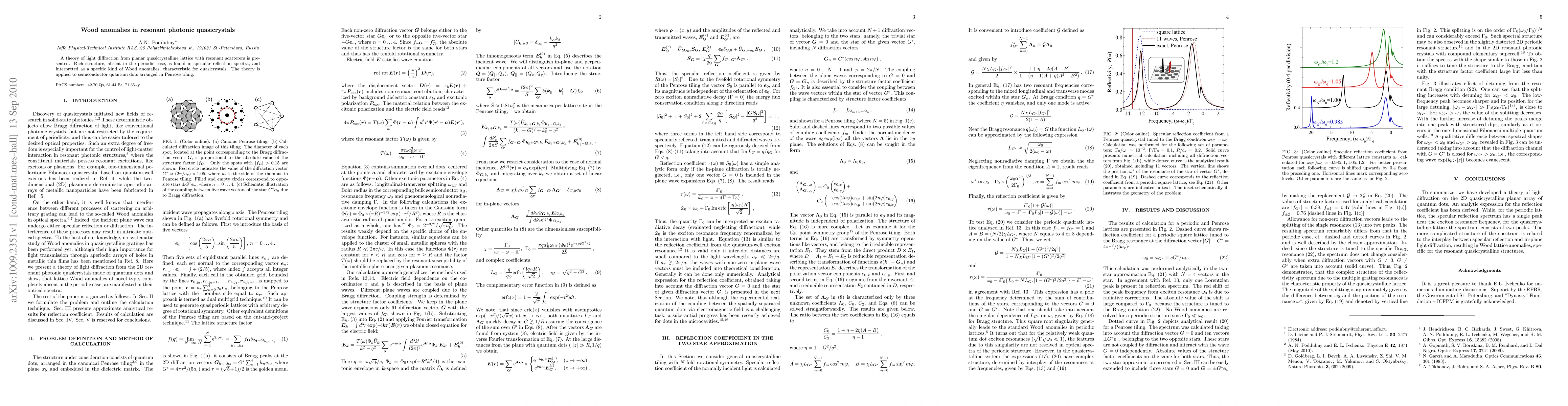 This paper presents a theory explaining light diffraction from planar quasicrystalline lattices with resonant scatterers, identifying unique Wood anomalies in specular reflection spectra due to the quasicrystalline structure, and applies the theory to semiconductor quantum dots arranged in Penrose tiling.