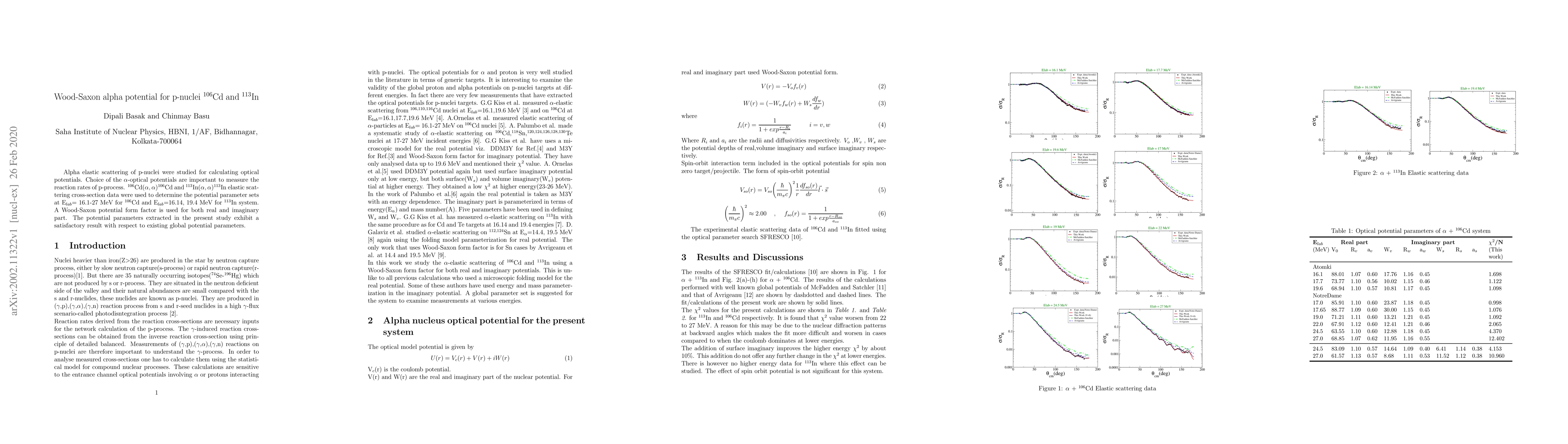 Alpha elastic scattering of p-nuclei were studied for calculating optical potentials. Choice of the $\alpha$-optical potentials are important to measure the reaction rates of p-process. $^{106}$Cd$(\alpha,\alpha)^{106}$Cd and $^{113}$In$(\alpha,\alpha)^{113}$In elastic scattering cross-section data were used to determine the potential parameter sets at E$_{lab}$= 16.1-27 MeV for $^{106}$Cd and E$_{lab}$=16.14, 19.4 MeV for $^{113}$In system. A Wood-Saxon potential form factor is used for both real and imaginary part. The potential parameters extracted in the present study exhibit a satisfactory result with respect to existing global potential parameters.