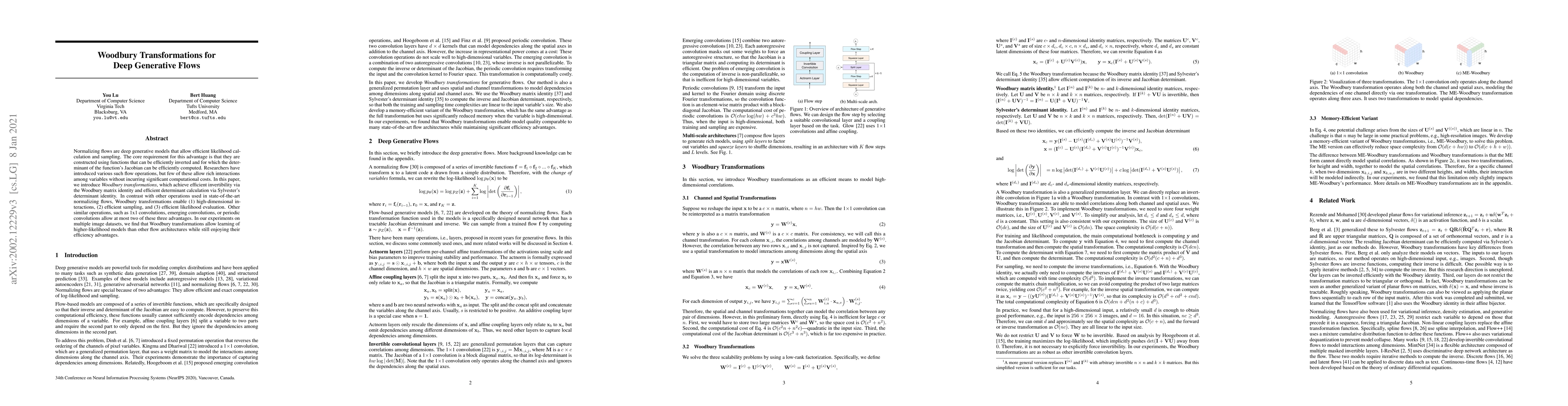 This paper introduces Woodbury Transformations for Deep Generative Flows, offering efficient invertibility, determinant calculation, and enabling high-dimensional variable interactions without significant computational costs. Experiments on image datasets show these transformations learn higher-likelihood models than other flow architectures, maintaining efficiency.