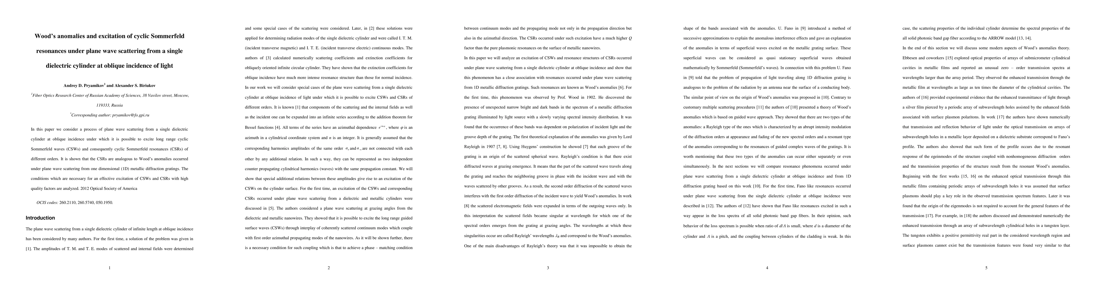 This paper investigates plane wave scattering from a single dielectric cylinder at oblique incidence, focusing on the excitation of cyclic Sommerfeld waves and resonances. It demonstrates that these resonances are analogous to Wood's anomalies in metallic diffraction gratings and analyzes the conditions for high-quality factor excitation.