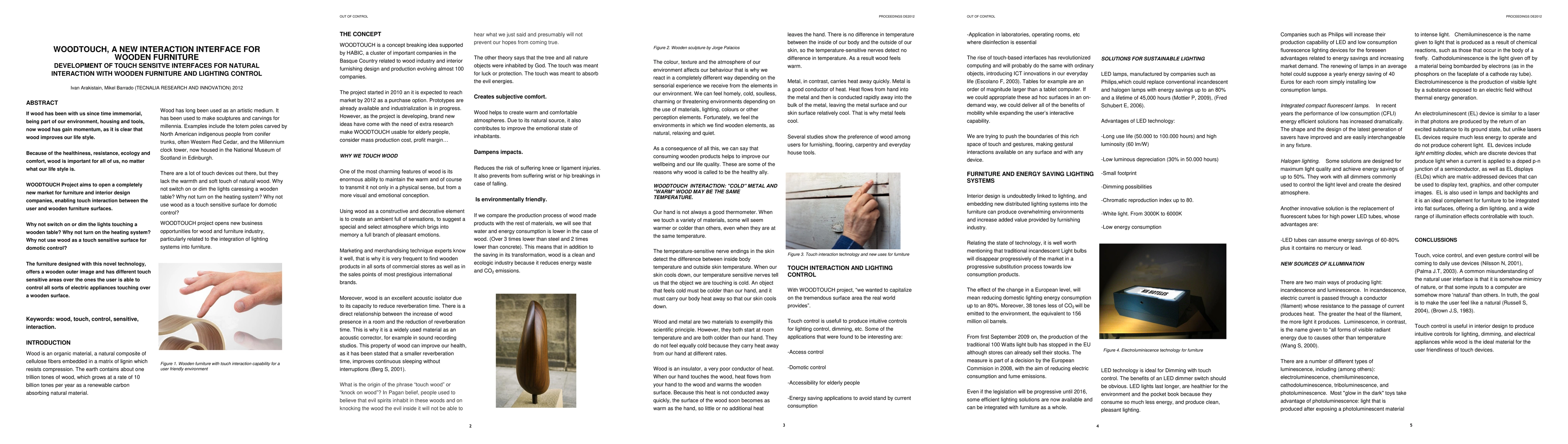 If wood has been with us since time immemorial, being part of our environment, housing and tools, now wood has gain momentum, as it is clear that wood improves our life style. Because of the healthiness, resistance, ecology and comfort, wood is important for all of us, no matter what our life style is. WOODTOUCH Project aims to open a completely new market for furniture and interior design companies, enabling touch interaction between the user and wooden furniture surfaces. Why not switch on or dim the lights touching a wooden table? Why not turn on the heating system? Why not use wood as a touch sensitive surface for domotic control? The furniture designed with this novel technology, offers a wooden outer image and has different touch sensitive areas over the ones the user is able to control all sorts of electric appliances touching over a wooden surface.