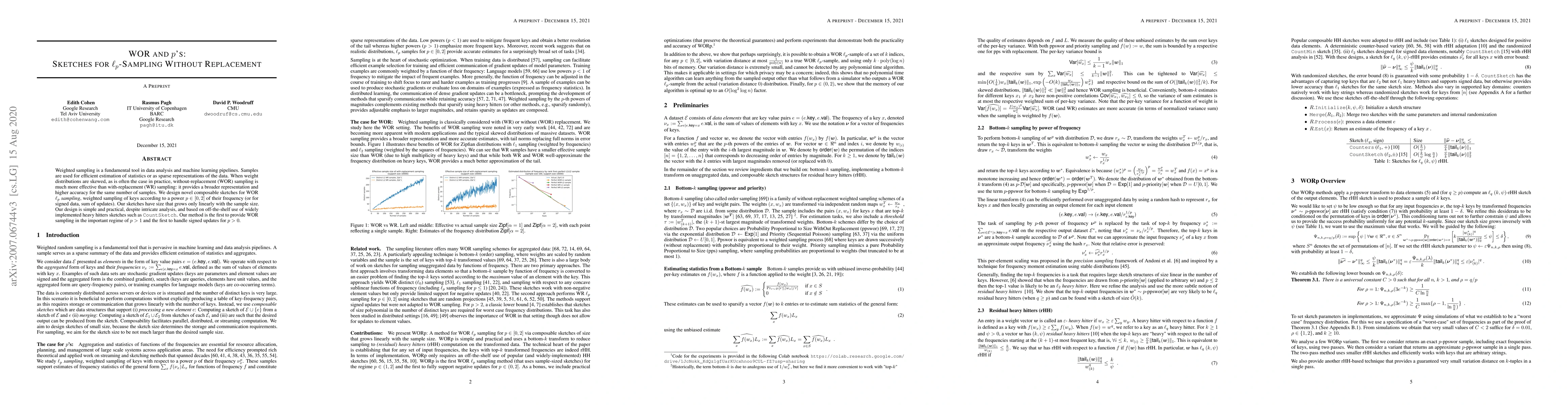 This paper introduces novel composable sketches for efficient weighted without-replacement $\ell_p$ sampling, offering a broader representation and higher accuracy for skewed weight distributions. The proposed method leverages existing heavy hitters sketches and scales linearly with the sample size, providing the first solution for $p>1$ and handling signed updates.