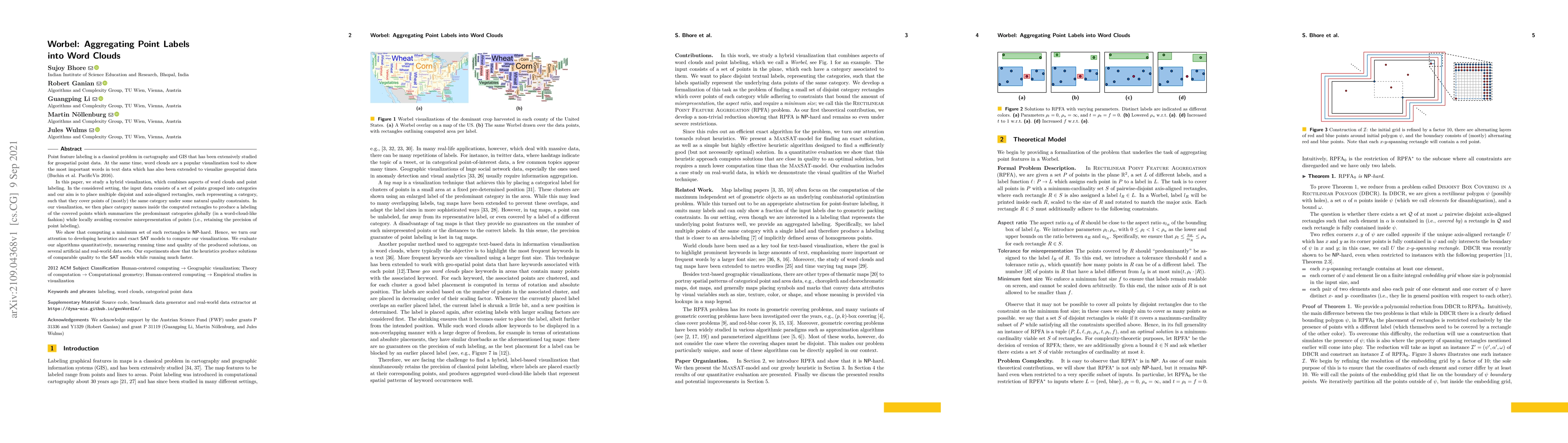 This paper introduces Worbel, a hybrid visualization method that combines word clouds and point labeling for geospatial data. It shows that finding minimal rectangles for category placement is NP-hard, then develops heuristics and SAT models for computation. Experiments demonstrate that heuristics provide faster, high-quality solutions compared to exact SAT models.