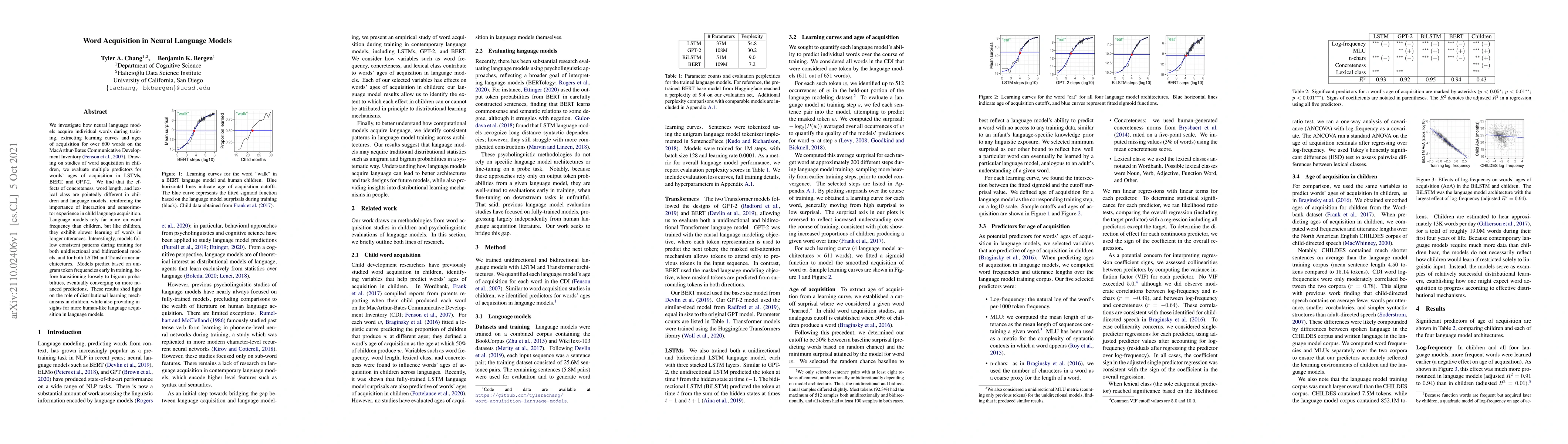 This study examines how neural language models acquire individual words, comparing learning curves and acquisition ages to those of children. It finds that while models rely heavily on word frequency, they differ from children in the impact of concreteness, word length, and lexical class, highlighting the role of interaction and sensorimotor experience in human language acquisition.