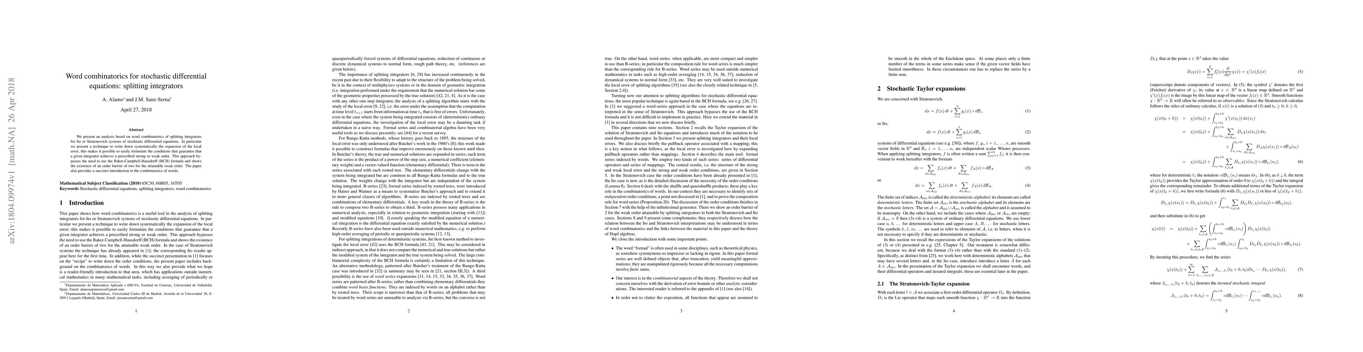 We present an analysis based on word combinatorics of splitting integrators for Ito or Stratonovich systems of stochastic differential equations. In particular we present a technique to write down systematically the expansion of the local error; this makes it possible to easily formulate the conditions that guarantee that a given integrator achieves a prescribed strong or weak order. This approach bypasses the need to use the Baker-Campbell-Hausdorff (BCH) formula and shows the existence of an order barrier of two for the attainable weak order. The paper also provides a succinct introduction to the combinatorics of words.
