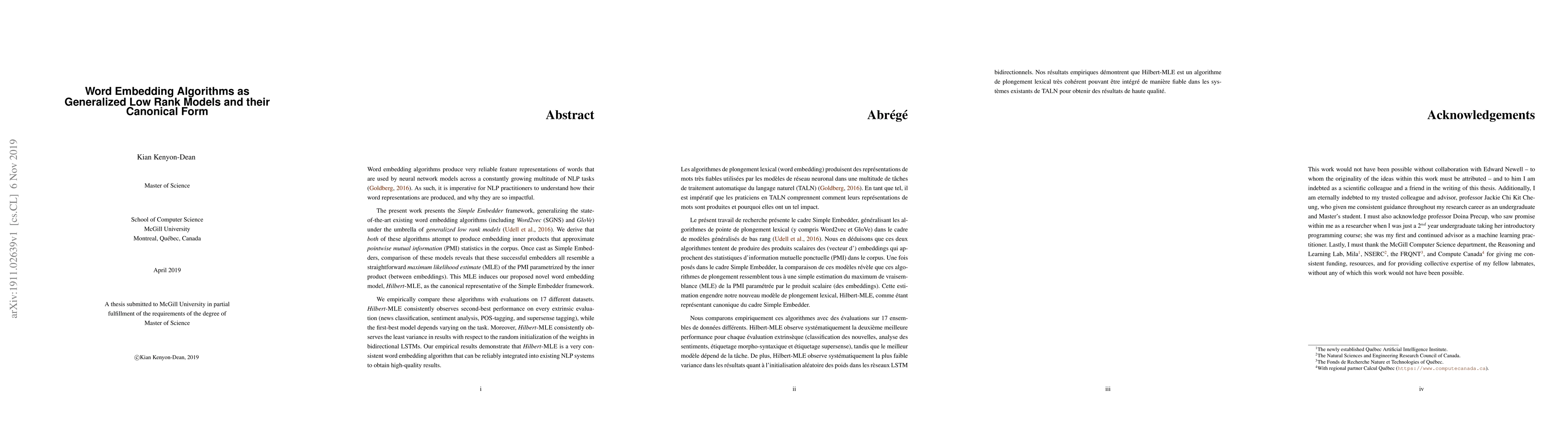 Word embedding algorithms produce very reliable feature representations of words that are used by neural network models across a constantly growing multitude of NLP tasks. As such, it is imperative for NLP practitioners to understand how their word representations are produced, and why they are so impactful. The present work presents the Simple Embedder framework, generalizing the state-of-the-art existing word embedding algorithms (including Word2vec (SGNS) and GloVe) under the umbrella of generalized low rank models. We derive that both of these algorithms attempt to produce embedding inner products that approximate pointwise mutual information (PMI) statistics in the corpus. Once cast as Simple Embedders, comparison of these models reveals that these successful embedders all resemble a straightforward maximum likelihood estimate (MLE) of the PMI parametrized by the inner product (between embeddings). This MLE induces our proposed novel word embedding model, Hilbert-MLE, as the canonical representative of the Simple Embedder framework. We empirically compare these algorithms with evaluations on 17 different datasets. Hilbert-MLE consistently observes second-best performance on every extrinsic evaluation (news classification, sentiment analysis, POS-tagging, and supersense tagging), while the first-best model depends varying on the task. Moreover, Hilbert-MLE consistently observes the least variance in results with respect to the random initialization of the weights in bidirectional LSTMs. Our empirical results demonstrate that Hilbert-MLE is a very consistent word embedding algorithm that can be reliably integrated into existing NLP systems to obtain high-quality results.