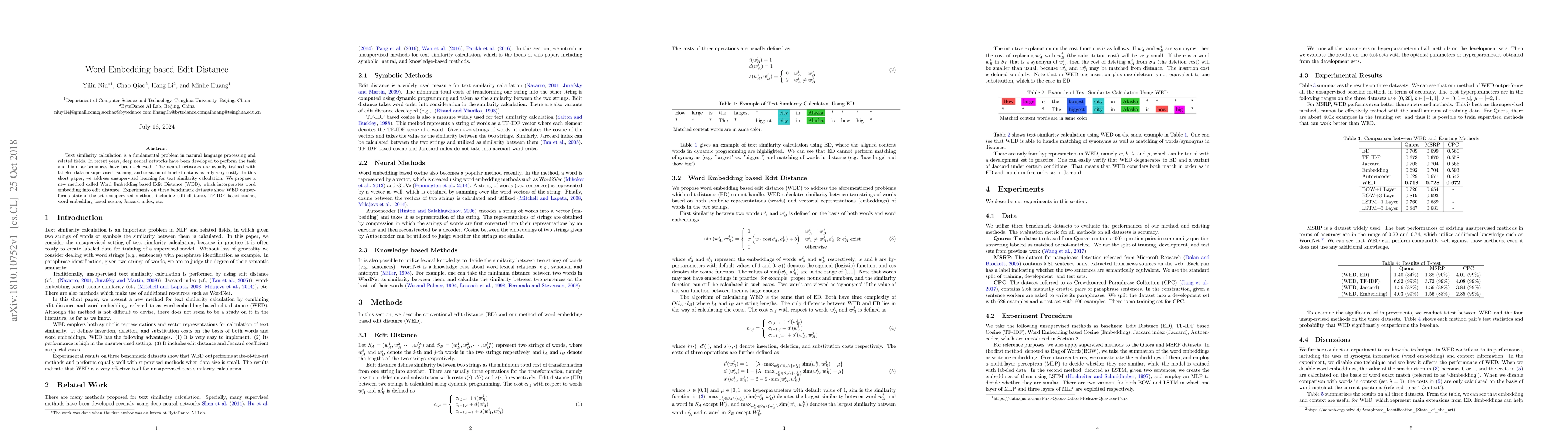 This paper introduces Word Embedding based Edit Distance (WED), an unsupervised method for text similarity calculation that integrates word embeddings into edit distance. Experiments demonstrate WED outperforms existing unsupervised techniques on benchmark datasets.