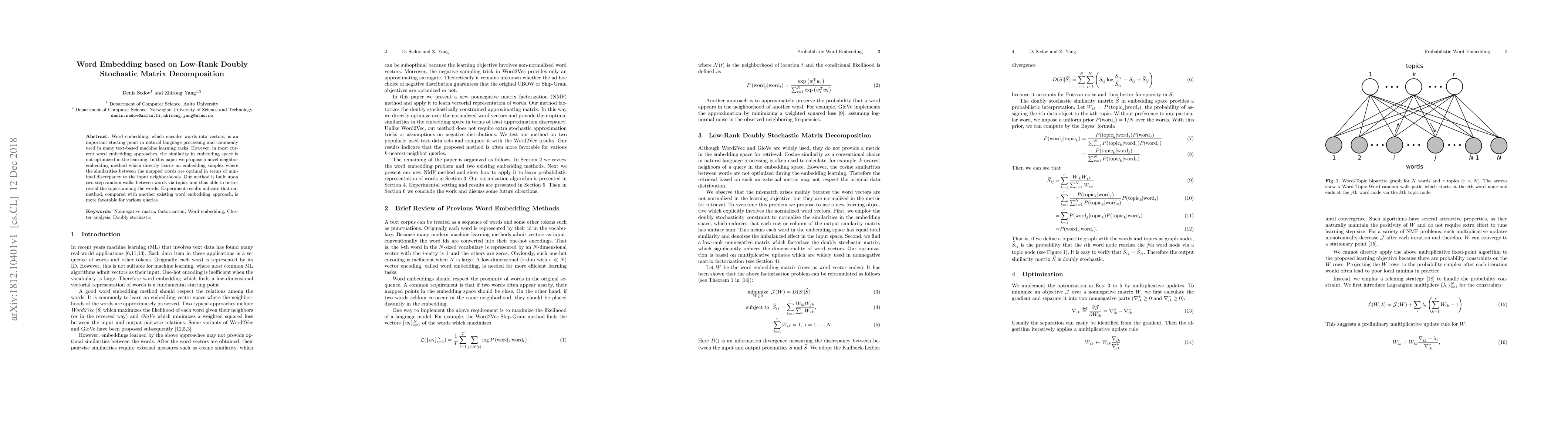 This paper proposes a novel word embedding method that optimizes word similarity through a low-rank doubly stochastic matrix decomposition, enhancing the representation of word relationships based on topic-driven random walks. Experimental results show improved performance over existing methods in various text-based machine learning tasks.