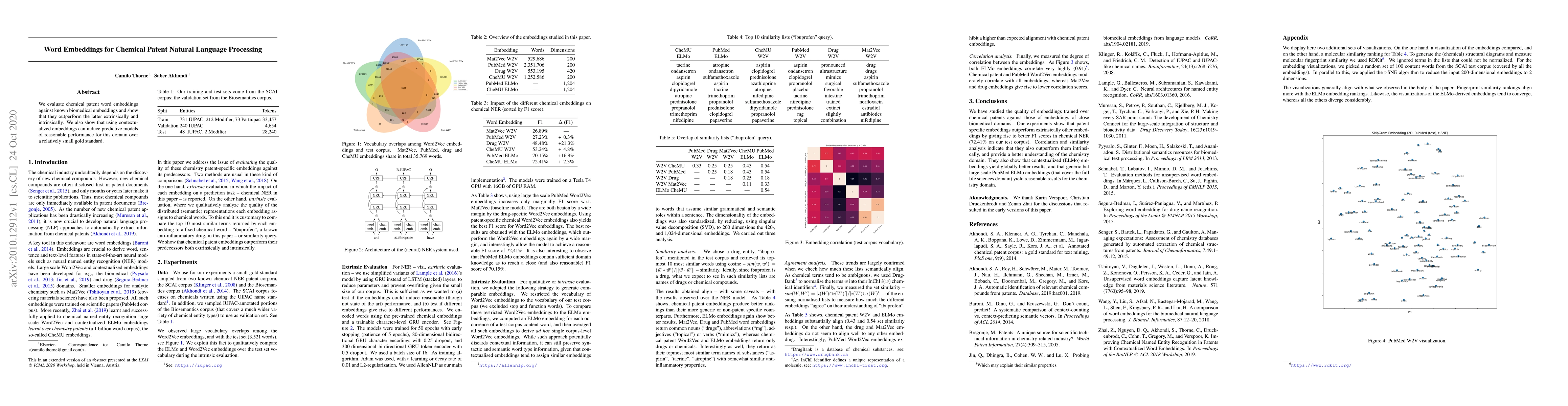 This paper evaluates chemical patent word embeddings, demonstrating their superior performance compared to biomedical embeddings both intrinsically and extrinsically. It also highlights the effectiveness of contextualized embeddings in generating predictive models for the chemical domain.