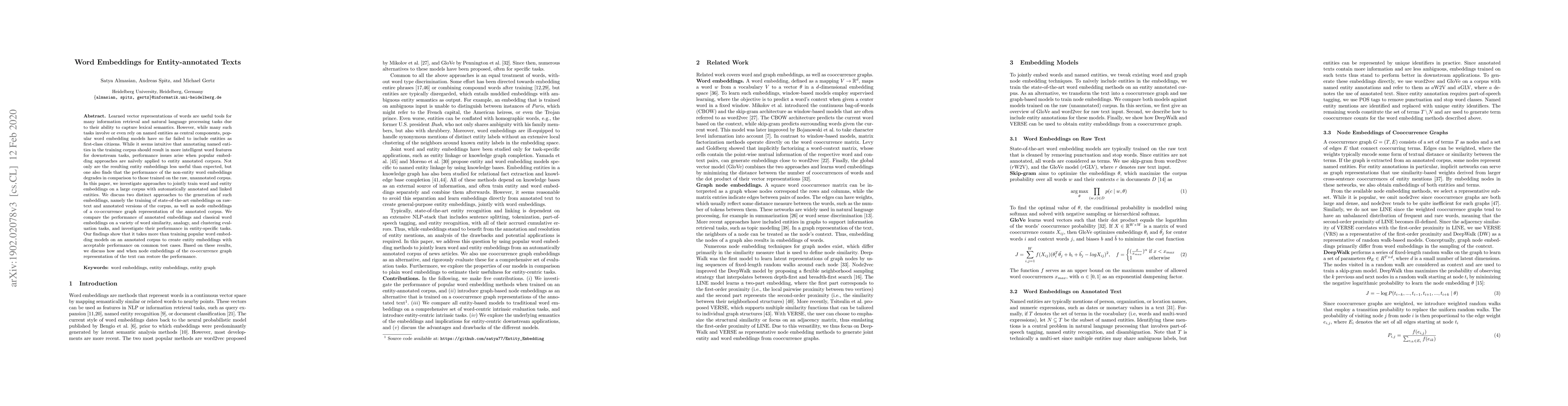 This paper explores methods to improve word embeddings for entity-annotated texts, finding that traditional embedding models fail to leverage entity annotations effectively. It proposes two approaches: training state-of-the-art embeddings on annotated corpora and using node embeddings from a co-occurrence graph, and demonstrates that the latter can restore performance in entity-specific tasks.