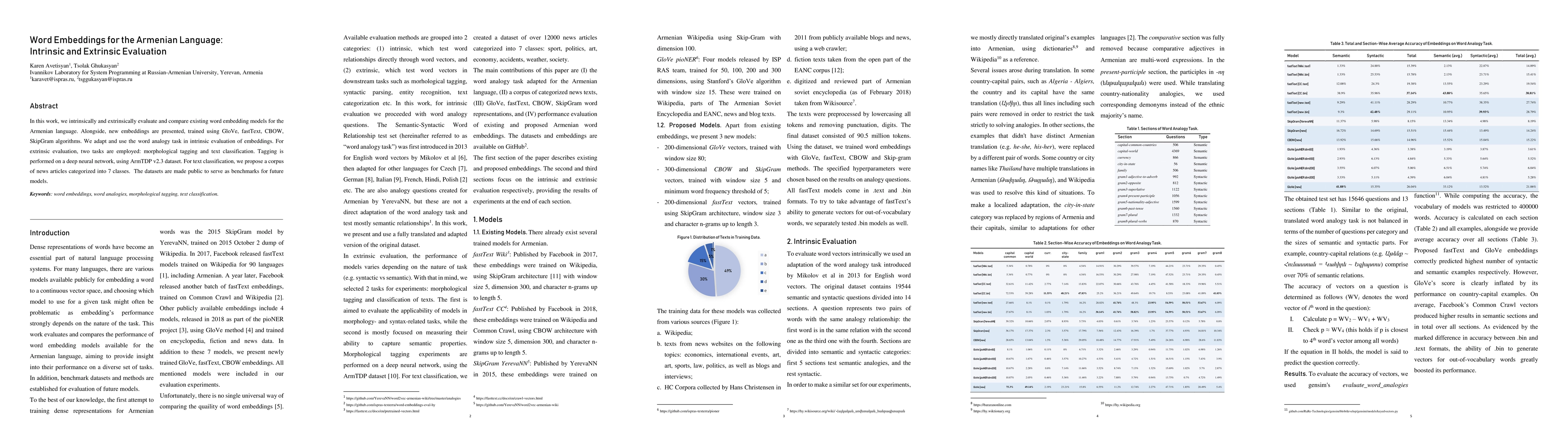 This paper evaluates existing word embedding models for Armenian through intrinsic and extrinsic methods, introducing new embeddings trained via GloVe, fastText, CBOW, and SkipGram. It uses word analogy tasks for intrinsic evaluation and morphological tagging and text classification for extrinsic evaluation, releasing datasets for future benchmarking.