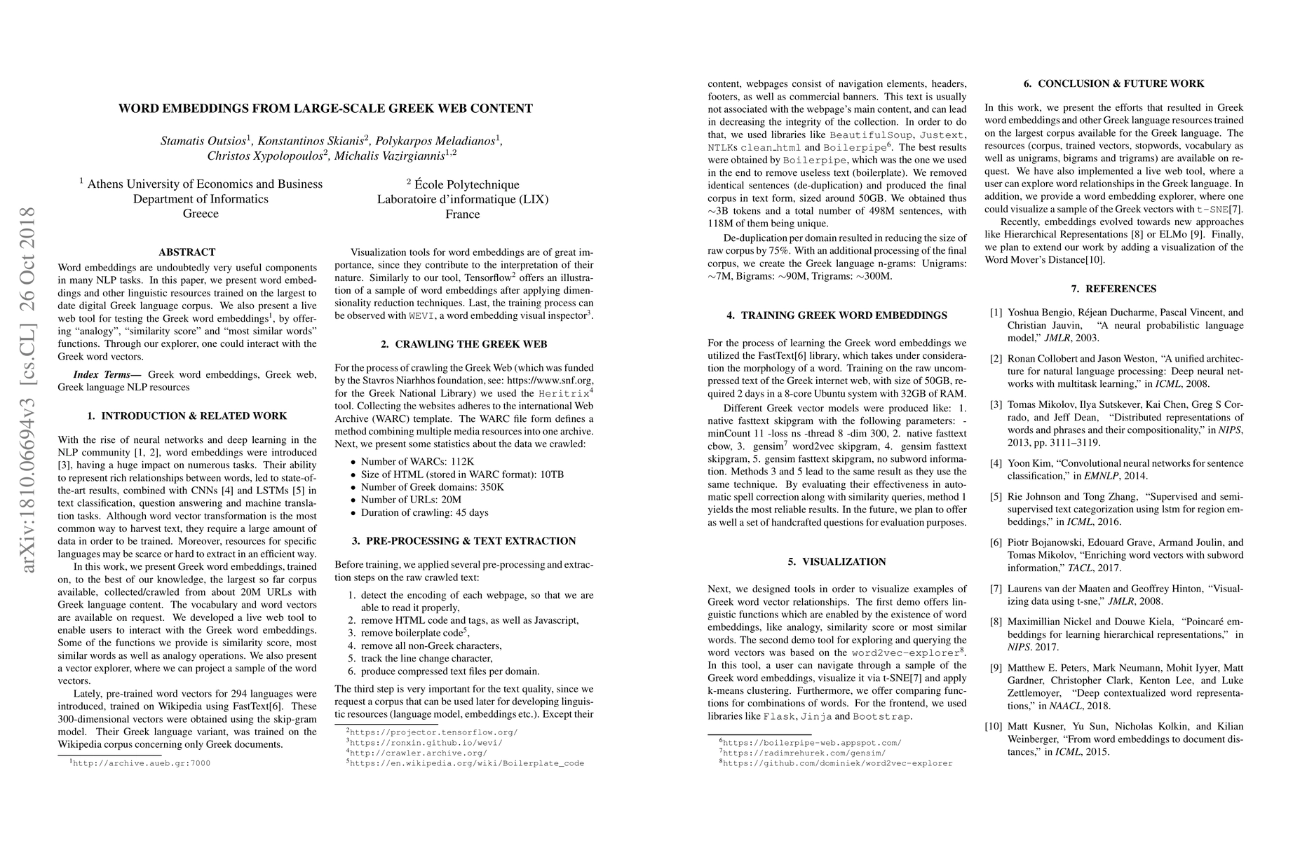 This paper introduces word embeddings and linguistic resources derived from a large Greek language corpus, along with a web tool for exploring "analogy," "similarity score," and "most similar words" functionalities for Greek word vectors.