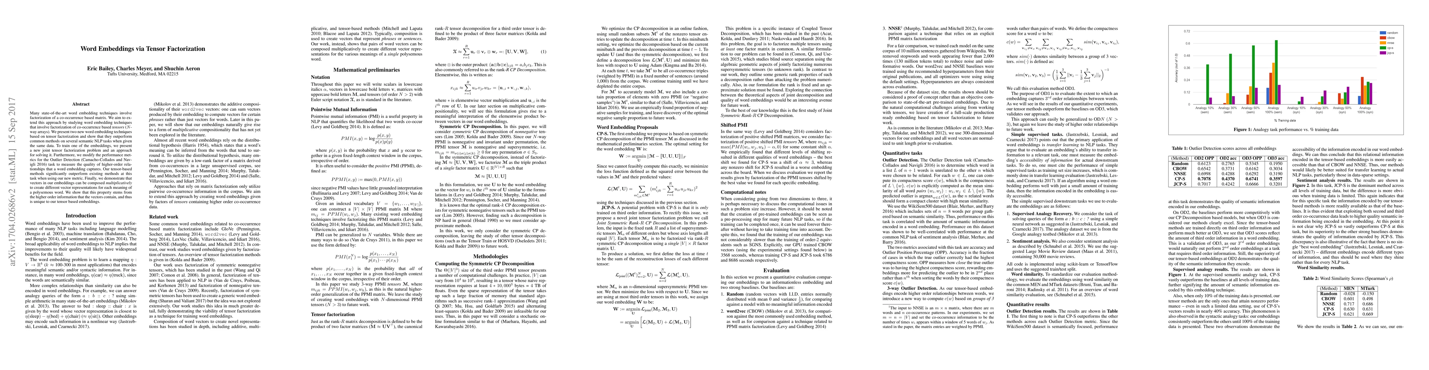 This paper proposes four word embedding techniques using tensor factorization to capture higher-order word co-occurrences, demonstrating their ability to discern polysemous word meanings and outperforming matrix-based methods in capturing complex word relations. The study also introduces a modified evaluation metric and shows competitive performance against state-of-the-art baselines.