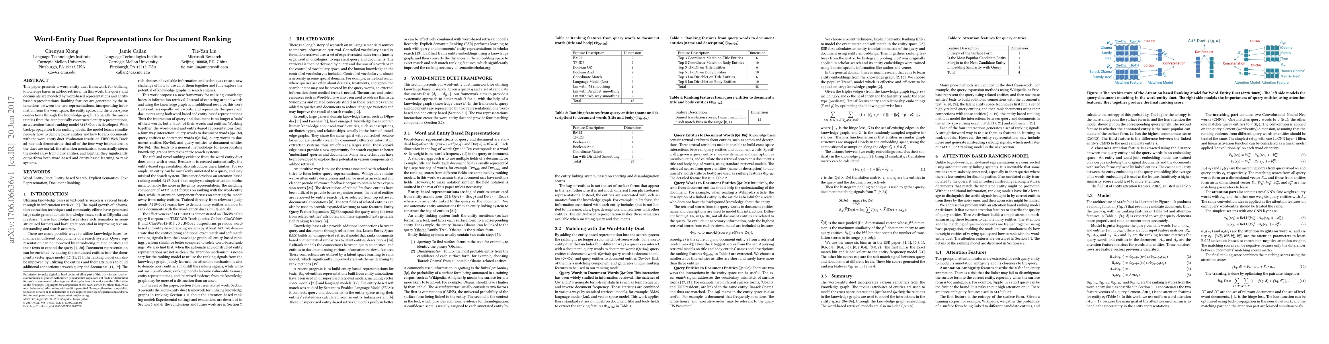 This paper introduces a word-entity duet framework for document ranking that leverages knowledge bases, combining word-based and entity-based representations to generate ranking features. An attention-based model, AttR-Duet, is developed to manage uncertainties in entity representations, achieving superior performance over word-based and entity-based systems in TREC Web Track evaluations.