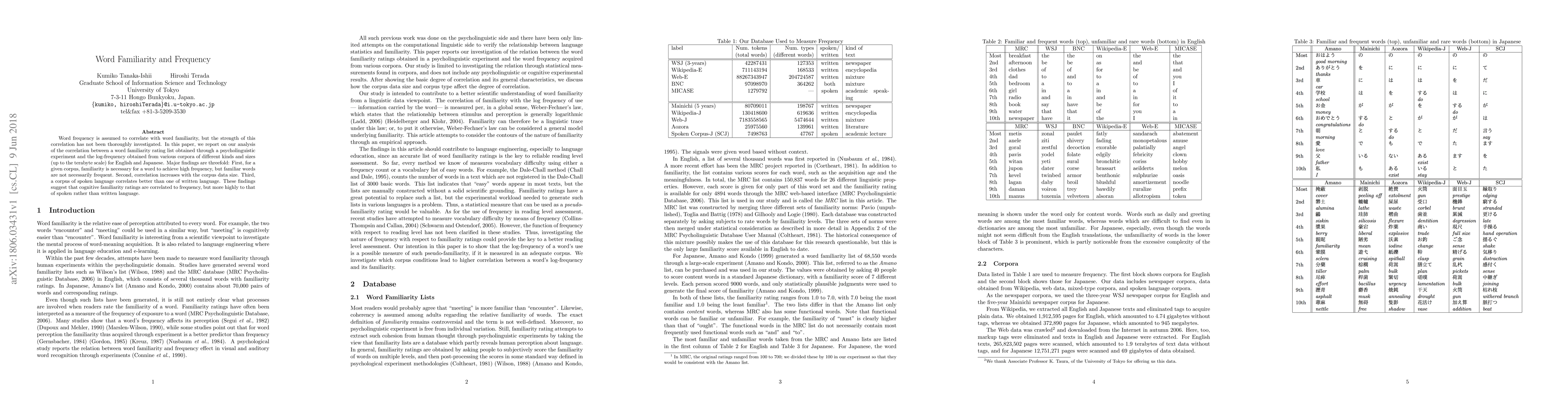 This study investigates the correlation between word familiarity and frequency, finding that while familiarity is necessary for high frequency, not all familiar words are frequent. The correlation strengthens with larger corpus sizes and is stronger for spoken than written language corpora.