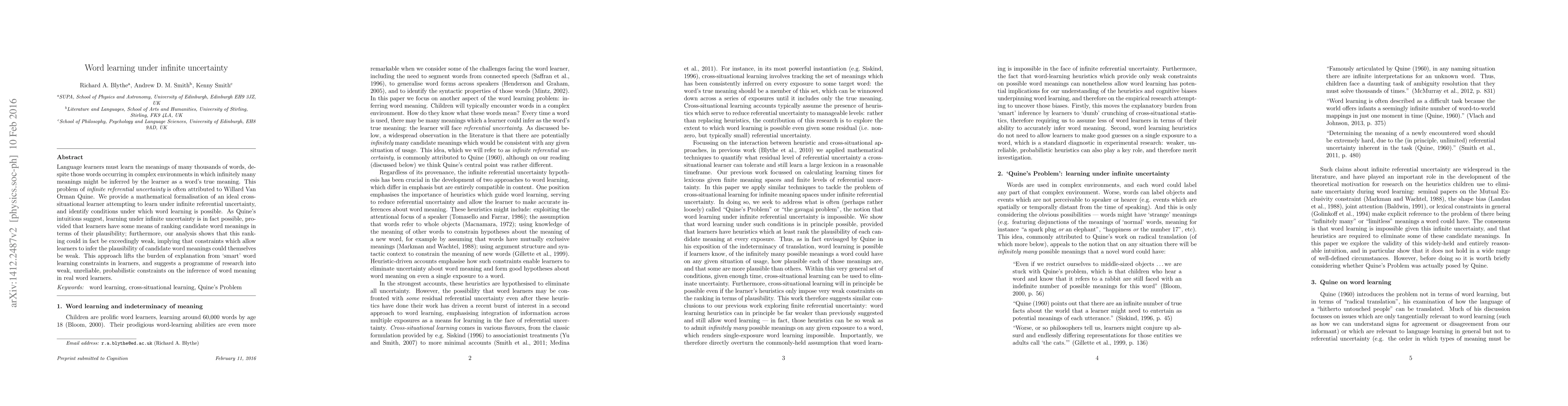 Language learners must learn the meanings of many thousands of words, despite those words occurring in complex environments in which infinitely many meanings might be inferred by the learner as a word's true meaning. This problem of infinite referential uncertainty is often attributed to Willard Van Orman Quine. We provide a mathematical formalisation of an ideal cross-situational learner attempting to learn under infinite referential uncertainty, and identify conditions under which word learning is possible. As Quine's intuitions suggest, learning under infinite uncertainty is in fact possible, provided that learners have some means of ranking candidate word meanings in terms of their plausibility; furthermore, our analysis shows that this ranking could in fact be exceedingly weak, implying that constraints which allow learners to infer the plausibility of candidate word meanings could themselves be weak. This approach lifts the burden of explanation from `smart' word learning constraints in learners, and suggests a programme of research into weak, unreliable, probabilistic constraints on the inference of word meaning in real word learners.