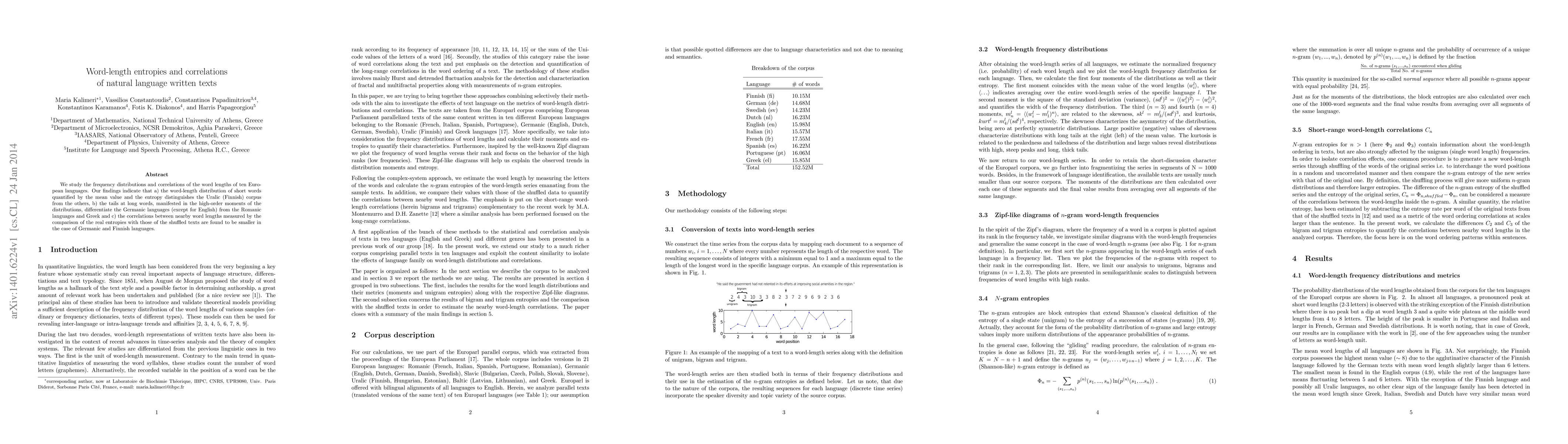 This study investigates the frequency distributions and correlations of word lengths across ten European languages, revealing distinct patterns: Finnish stands out in short word entropy, Germanic languages (except English) differ in long word distributions, and correlations between word lengths are lower in Germanic and Finnish languages compared to others.