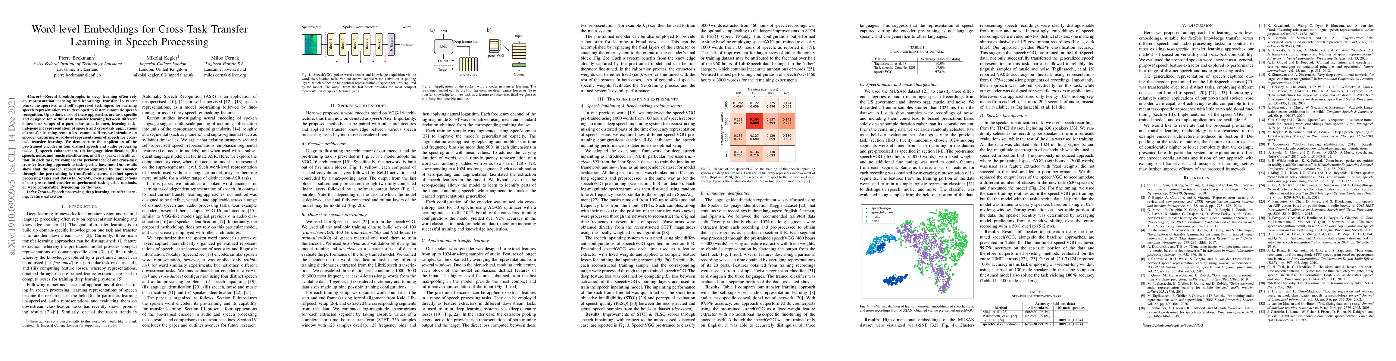 Recent breakthroughs in deep learning often rely on representation learning and knowledge transfer. In recent years, unsupervised and self-supervised techniques for learning speech representation were developed to foster automatic speech recognition. Up to date, most of these approaches are task-specific and designed for within-task transfer learning between different datasets or setups of a particular task. In turn, learning task-independent representation of speech and cross-task applications of transfer learning remain less common. Here, we introduce an encoder capturing word-level representations of speech for cross-task transfer learning. We demonstrate the application of the pre-trained encoder in four distinct speech and audio processing tasks: (i) speech enhancement, (ii) language identification, (iii) speech, noise, and music classification, and (iv) speaker identification. In each task, we compare the performance of our cross-task transfer learning approach to task-specific baselines. Our results show that the speech representation captured by the encoder through the pre-training is transferable across distinct speech processing tasks and datasets. Notably, even simple applications of our pre-trained encoder outperformed task-specific methods, or were comparable, depending on the task.