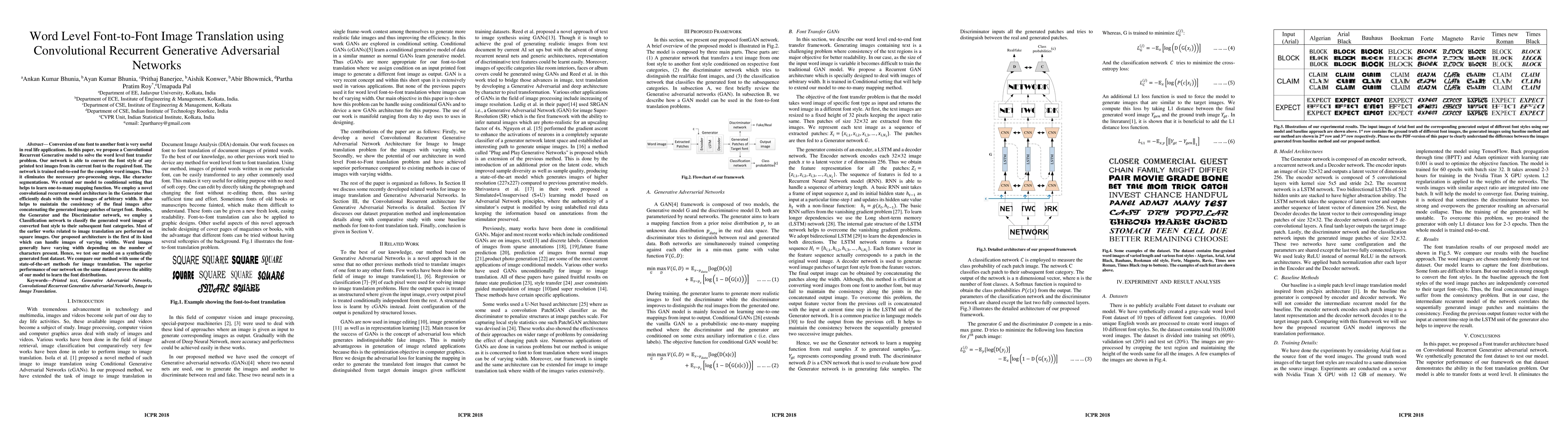 This paper proposes a Convolutional Recurrent Generative Adversarial Network (CR-GAN) for converting the font style of printed text images without requiring character segmentation. The model efficiently handles word images of varying widths and outperforms state-of-the-art methods in font-to-font translation tasks.