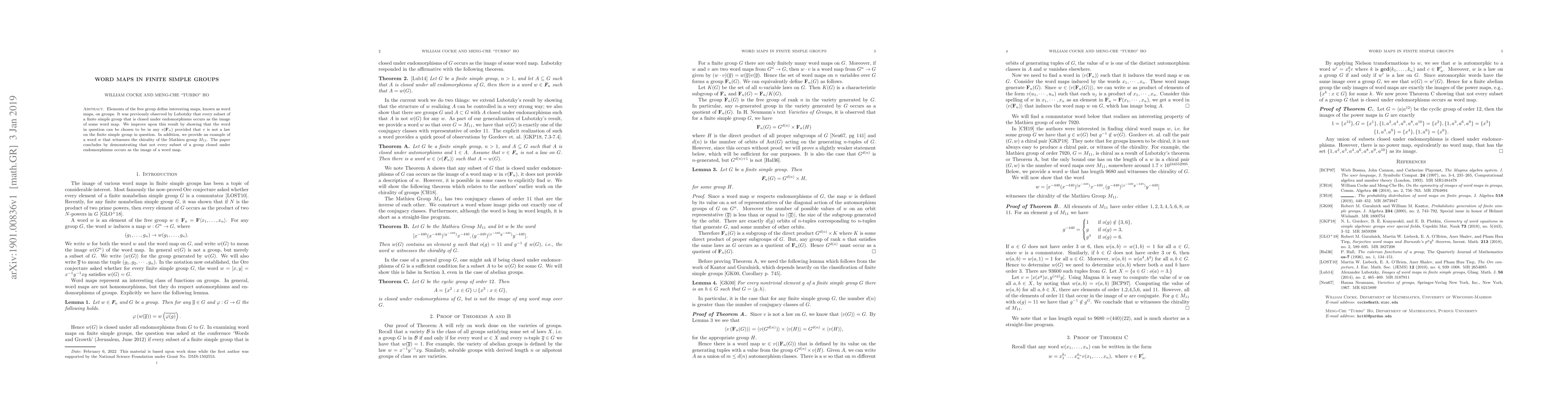 Elements of the free group define interesting maps, known as word maps, on groups. It was previously observed by Lubotzky that every subset of a finite simple group that is closed under endomorphisms occurs as the image of some word map. We improve upon this result by showing that the word in question can be chosen to be in any $v(\textbf{F}_n)$ provided that $v$ is not a law on the finite simple group in question. In addition, we provide an example of a word $w$ that witnesses the chirality of the Mathieu group $M_{11}$. The paper concludes by demonstrating that not every subset of a group closed under endomorphisms occurs as the image of a word map.