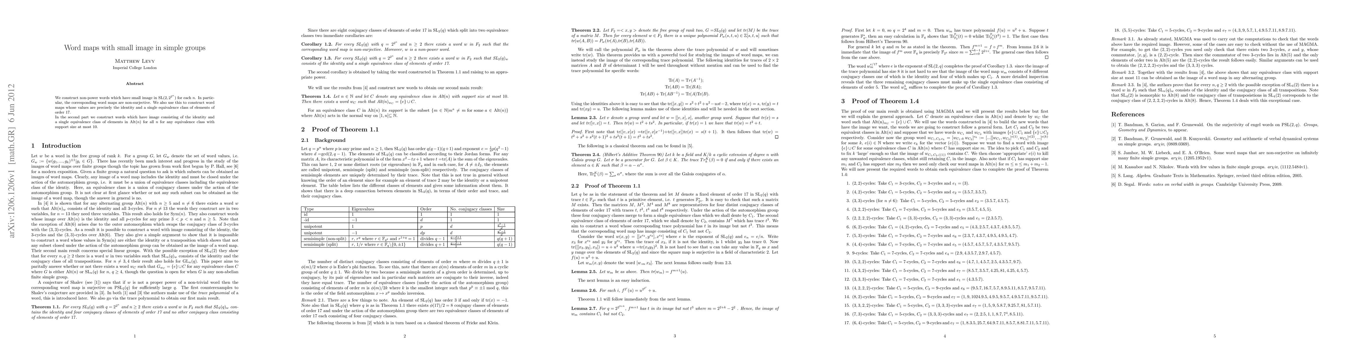 We construct non-power words which have small image in SL(2; 22n) for each n. In particular, the corresponding word maps are non-surjective. We also use this to construct word maps whose values are precisely the identity and a single equivalence class of elements of order 17. In the second part we construct words which have image consisting of the identity and a single equivalence class of elements in Alt(n) for all n for any equivalence class with support size at most 10.