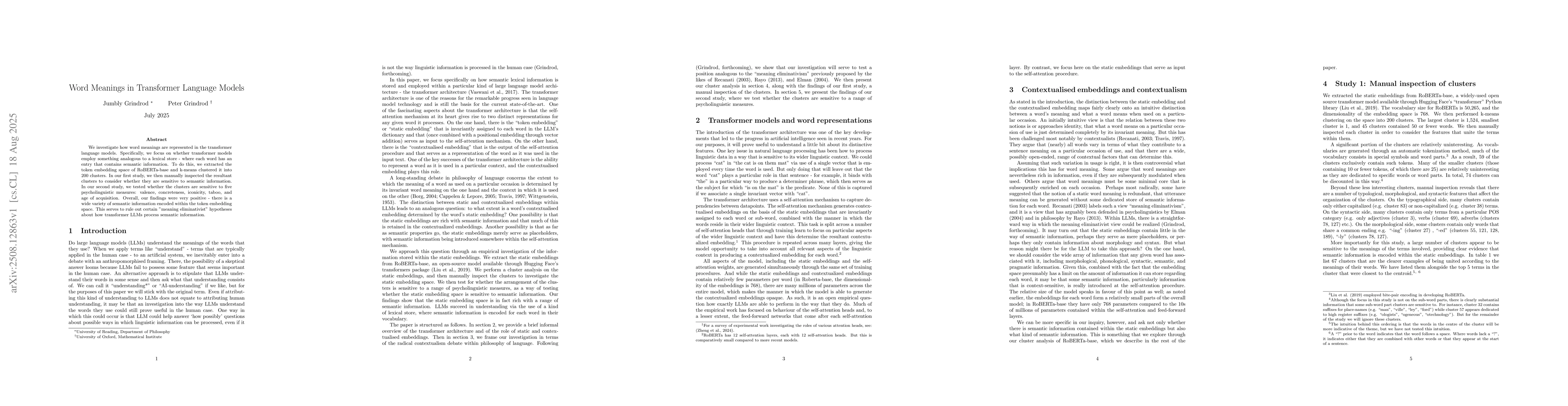We investigate how word meanings are represented in the transformer language models. Specifically, we focus on whether transformer models employ something analogous to a lexical store - where each word has an entry that contains semantic information. To do this, we extracted the token embedding space of RoBERTa-base and k-means clustered it into 200 clusters. In our first study, we then manually inspected the resultant clusters to consider whether they are sensitive to semantic information. In our second study, we tested whether the clusters are sensitive to five psycholinguistic measures: valence, concreteness, iconicity, taboo, and age of acquisition. Overall, our findings were very positive - there is a wide variety of semantic information encoded within the token embedding space. This serves to rule out certain "meaning eliminativist" hypotheses about how transformer LLMs process semantic information.