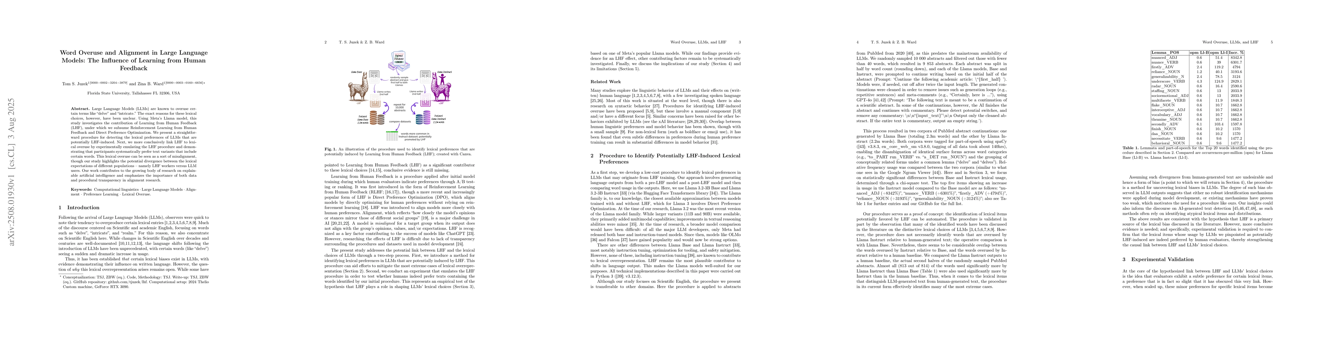 Large Language Models (LLMs) are known to overuse certain terms like "delve" and "intricate." The exact reasons for these lexical choices, however, have been unclear. Using Meta's Llama model, this study investigates the contribution of Learning from Human Feedback (LHF), under which we subsume Reinforcement Learning from Human Feedback and Direct Preference Optimization. We present a straightforward procedure for detecting the lexical preferences of LLMs that are potentially LHF-induced. Next, we more conclusively link LHF to lexical overuse by experimentally emulating the LHF procedure and demonstrating that participants systematically prefer text variants that include certain words. This lexical overuse can be seen as a sort of misalignment, though our study highlights the potential divergence between the lexical expectations of different populations -- namely LHF workers versus LLM users. Our work contributes to the growing body of research on explainable artificial intelligence and emphasizes the importance of both data and procedural transparency in alignment research.