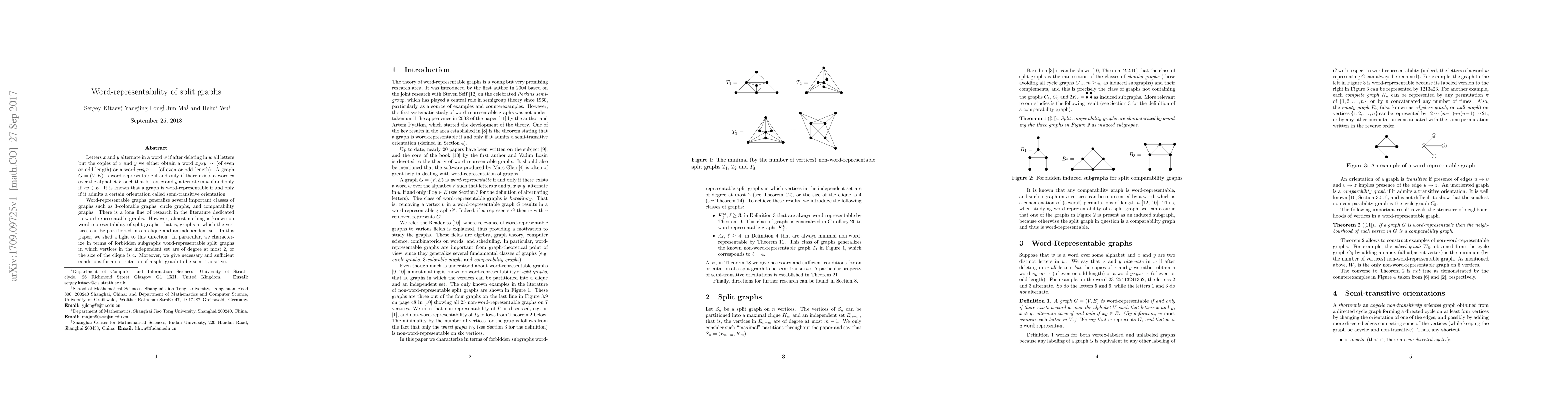 This paper investigates the word-representability of split graphs, providing conditions for their orientation to be semi-transitive. It characterizes word-representable split graphs with specific constraints on independent set degrees and clique sizes, offering necessary and sufficient conditions for their semi-transitive orientations.