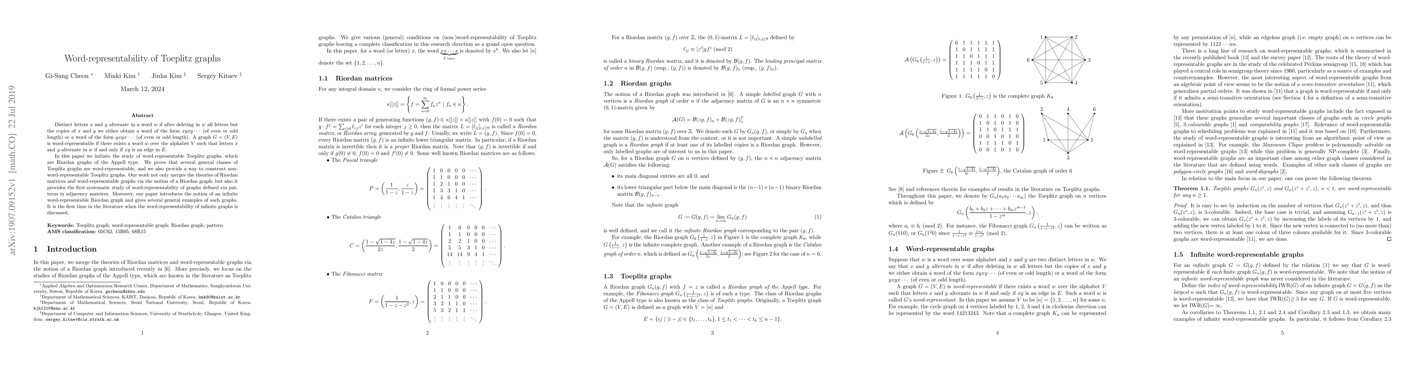 Distinct letters $x$ and $y$ alternate in a word $w$ if after deleting in $w$ all letters but the copies of $x$ and $y$ we either obtain a word of the form $xyxy\cdots$ (of even or odd length) or a word of the form $yxyx\cdots$ (of even or odd length). A graph $G=(V,E)$ is word-representable if there exists a word $w$ over the alphabet $V$ such that letters $x$ and $y$ alternate in $w$ if and only if $xy$ is an edge in $E$. In this paper we initiate the study of word-representable Toeplitz graphs, which are Riordan graphs of the Appell type. We prove that several general classes of Toeplitz graphs are word-representable, and we also provide a way to construct non-word-representable Toeplitz graphs. Our work not only merges the theories of Riordan matrices and word-representable graphs via the notion of a Riordan graph, but also it provides the first systematic study of word-representability of graphs defined via patterns in adjacency matrices. Moreover, our paper introduces the notion of an infinite word-representable Riordan graph and gives several general examples of such graphs. It is the first time in the literature when the word-representability of infinite graphs is discussed.