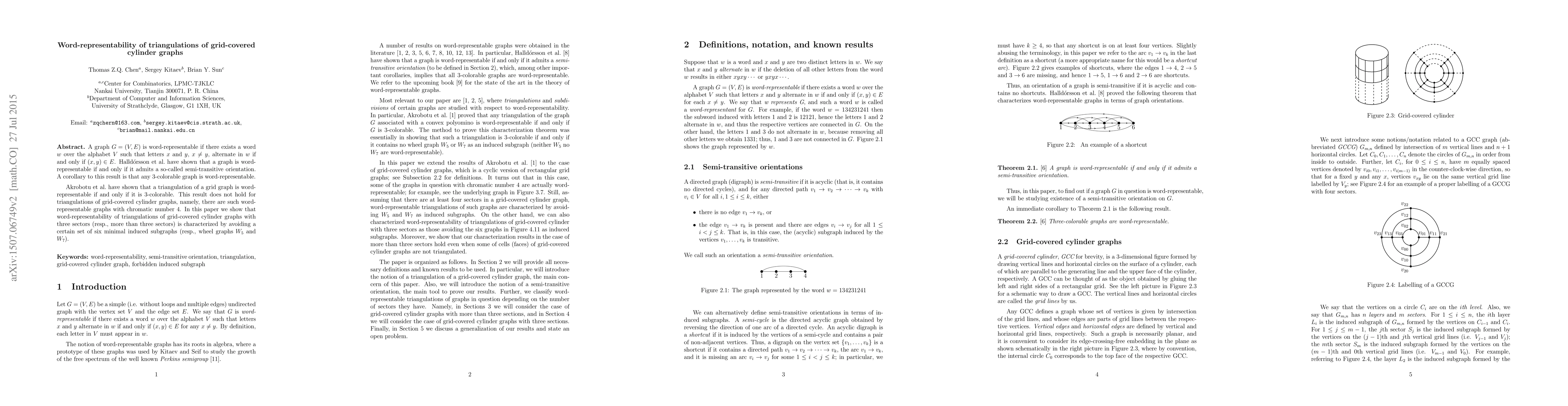 A graph $G=(V,E)$ is word-representable if there exists a word $w$ over the alphabet $V$ such that letters $x$ and $y$, $x\neq y$, alternate in $w$ if and only if $(x,y)\in E$. Halld\'{o}rsson et al.\ have shown that a graph is word-representable if and only if it admits a so-called semi-transitive orientation. A corollary to this result is that any 3-colorable graph is word-representable. Akrobotu et al.\ have shown that a triangulation of a grid graph is word-representable if and only if it is 3-colorable. This result does not hold for triangulations of grid-covered cylinder graphs, namely, there are such word-representable graphs with chromatic number 4. In this paper we show that word-representability of triangulations of grid-covered cylinder graphs with three sectors (resp., more than three sectors) is characterized by avoiding a certain set of six minimal induced subgraphs (resp., wheel graphs $W_5$ and $W_7$).