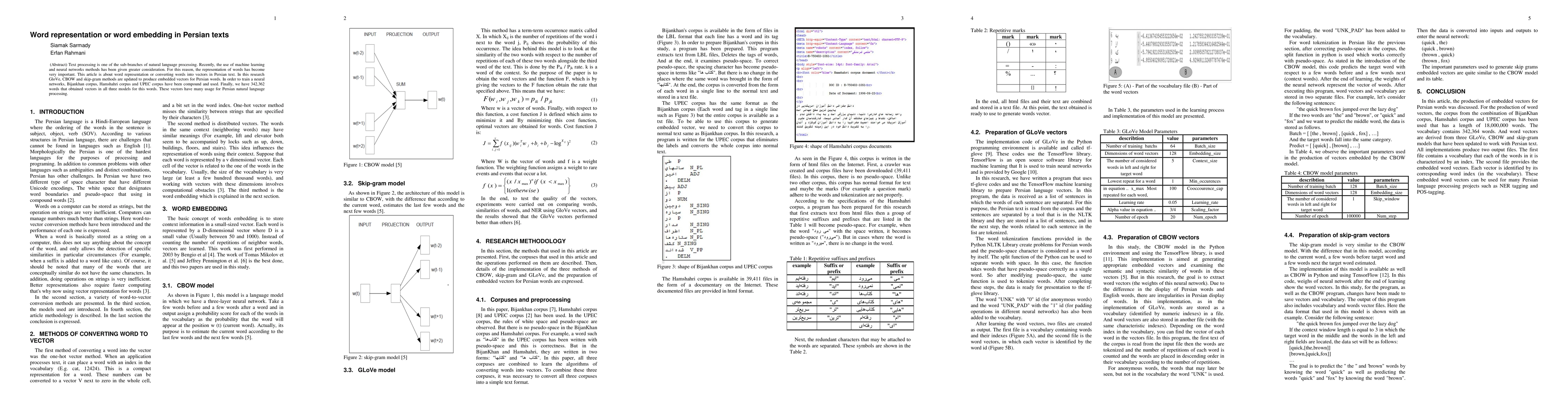 This research updates GloVe, CBOW, and skip-gram methods to create word embeddings for Persian text, utilizing combined corpora to train neural networks. The study produces vector representations for 342,362 Persian words, enhancing natural language processing applications.