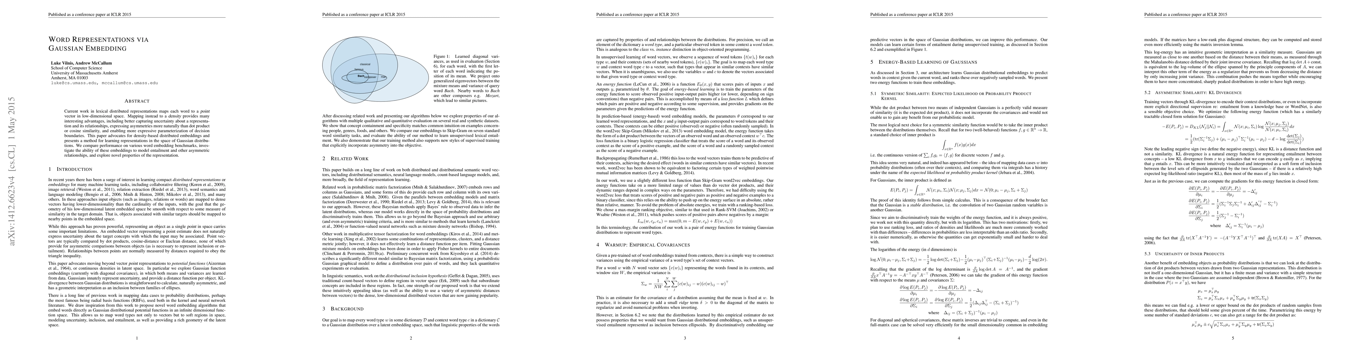 This paper proposes a novel method for learning word representations via Gaussian embeddings, which map words to density distributions rather than fixed vectors. The approach aims to better capture uncertainty, express asymmetric relationships, and enable more flexible decision boundaries, demonstrated through benchmark evaluations and analysis of entailment modeling.