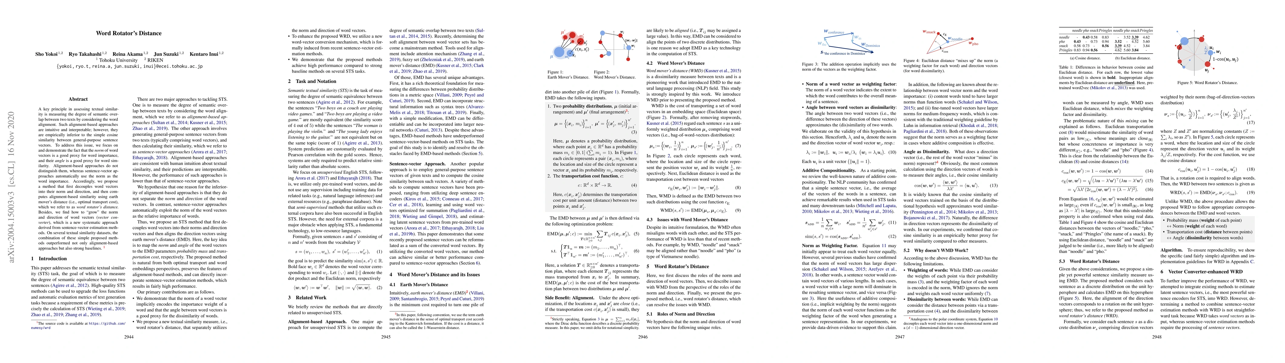 This paper proposes a novel "word rotator's distance" method for measuring textual similarity by decoupling word vectors into their norm and direction, and using earth mover's distance for alignment. The approach outperforms traditional alignment-based methods and strong baselines on several datasets.