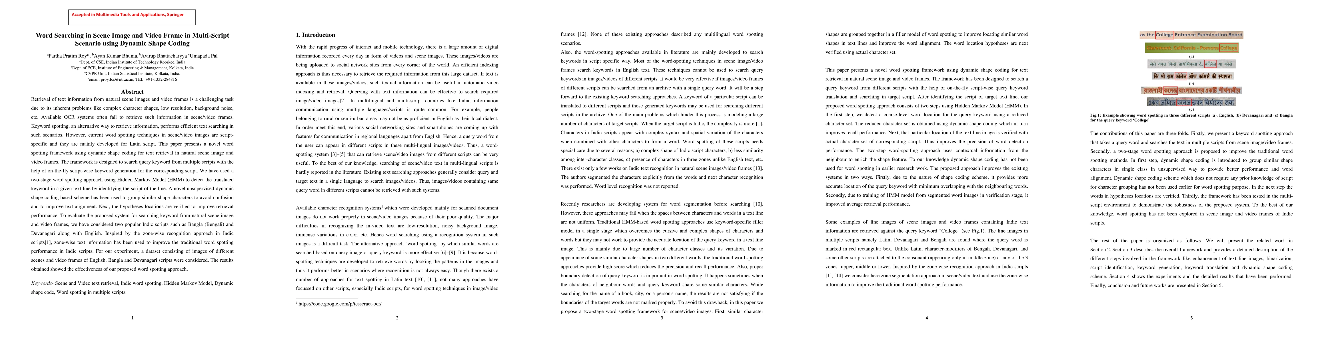 This research introduces a novel word spotting framework using dynamic shape coding for efficient text retrieval in natural scene images and video frames, addressing limitations of existing OCR systems. The proposed two-stage approach employs HMM and unsupervised dynamic shape coding to handle multiple scripts, demonstrating improved performance with Indic scripts like Bangla and Devanagari.