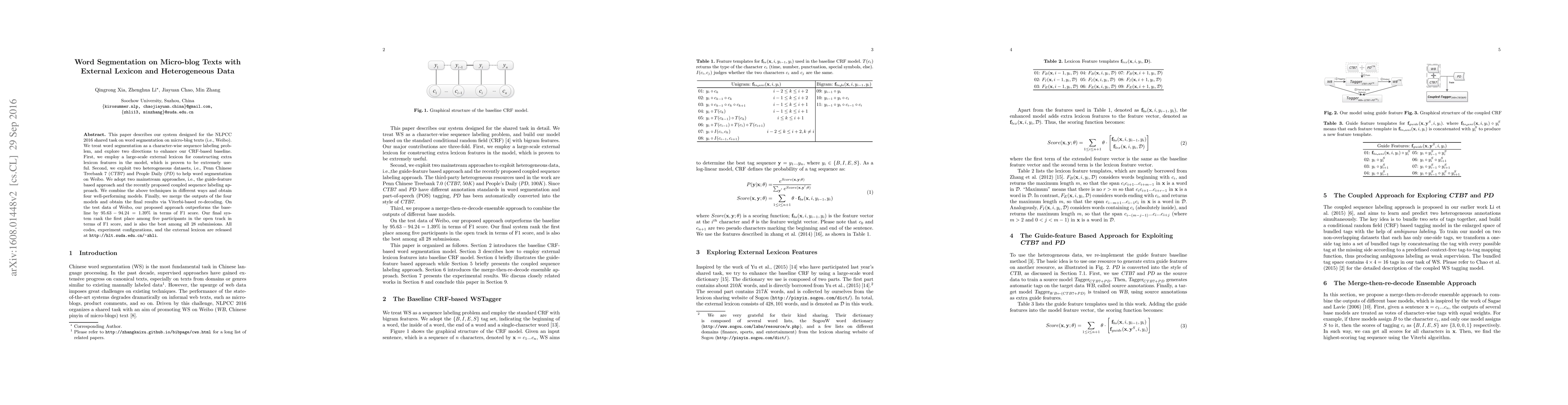 Summary: This paper presents a system for word segmentation in micro-blog texts, utilizing an external lexicon and heterogeneous data, developed for the NLPCC 2016 shared task. The approach aims to improve the accuracy of segmenting words in informal and abbreviated micro-blog language.