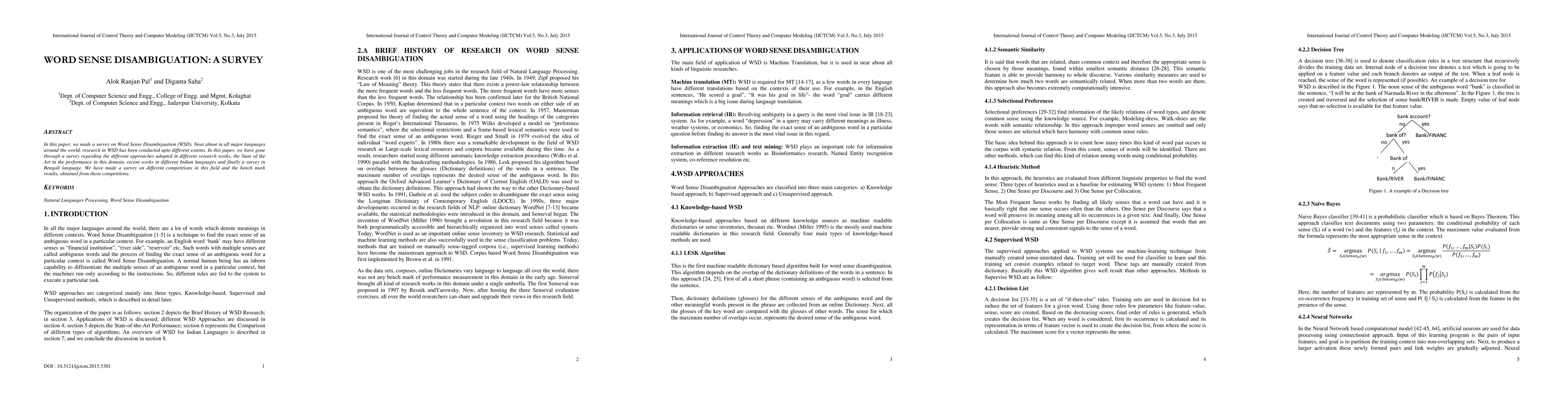 In this paper, we made a survey on Word Sense Disambiguation (WSD). Near about in all major languages around the world, research in WSD has been conducted upto different extents. In this paper, we have gone through a survey regarding the different approaches adopted in different research works, the State of the Art in the performance in this domain, recent works in different Indian languages and finally a survey in Bengali language. We have made a survey on different competitions in this field and the bench mark results, obtained from those competitions.