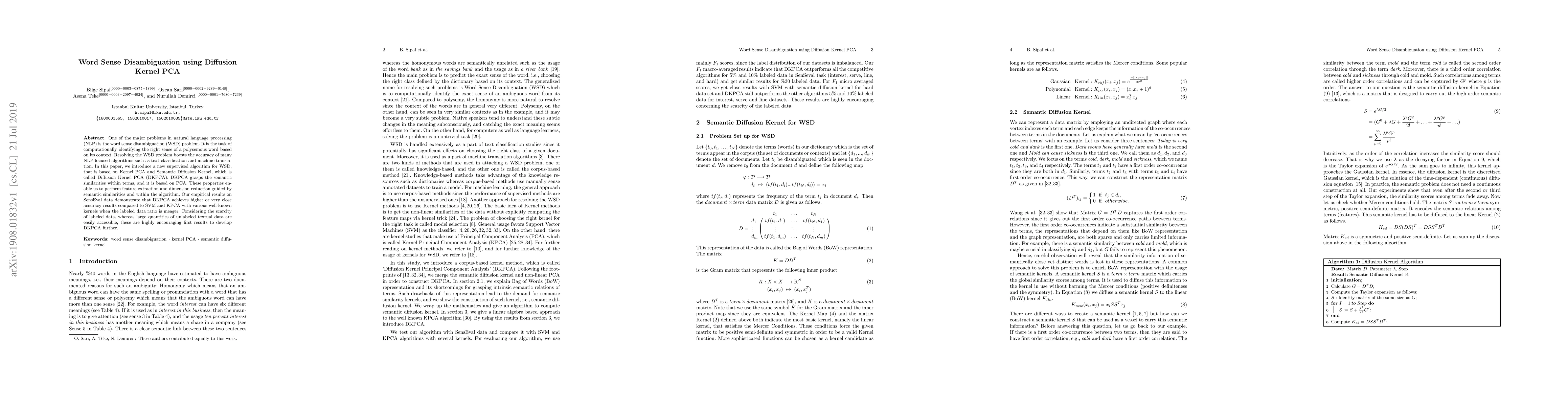 One of the major problems in natural language processing (NLP) is the word sense disambiguation (WSD) problem. It is the task of computationally identifying the right sense of a polysemous word based on its context. Resolving the WSD problem boosts the accuracy of many NLP focused algorithms such as text classification and machine translation. In this paper, we introduce a new supervised algorithm for WSD, that is based on Kernel PCA and Semantic Diffusion Kernel, which is called Diffusion Kernel PCA (DKPCA). DKPCA grasps the semantic similarities within terms, and it is based on PCA. These properties enable us to perform feature extraction and dimension reduction guided by semantic similarities and within the algorithm. Our empirical results on SensEval data demonstrate that DKPCA achieves higher or very close accuracy results compared to SVM and KPCA with various well-known kernels when the labeled data ratio is meager. Considering the scarcity of labeled data, whereas large quantities of unlabeled textual data are easily accessible, these are highly encouraging first results to develop DKPCA further.