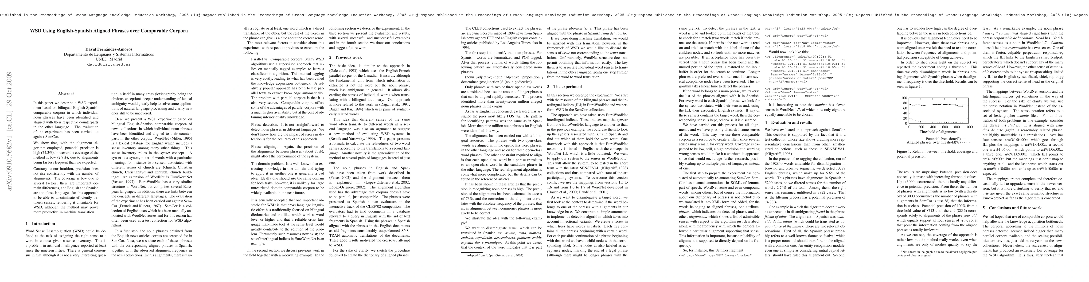 This paper explores word sense disambiguation (WSD) using aligned English-Spanish phrases from comparable corpora, achieving high precision (74.3%) but low coverage (2.7%) due to infrequent alignments. The study concludes that the method is ineffective for WSD but may be useful in machine translation.