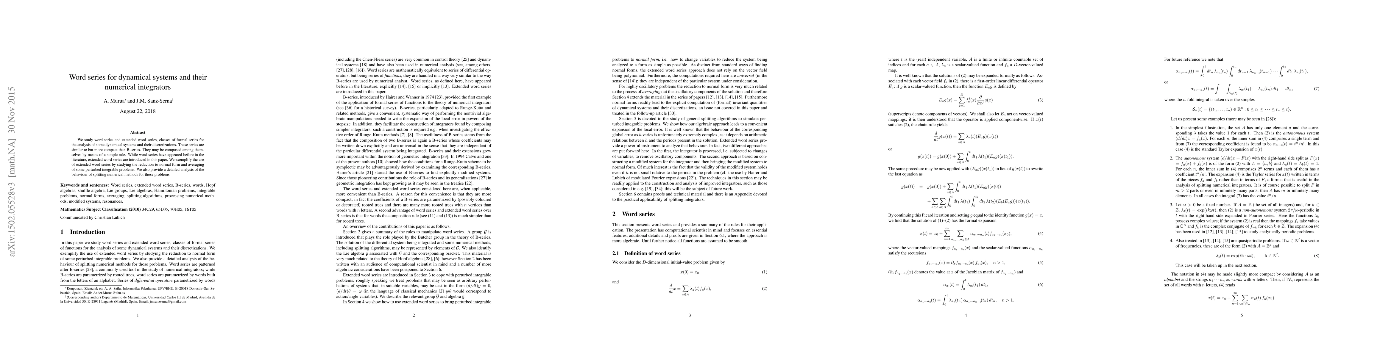 We study word series and extended word series, classes of formal series for the analysis of some dynamical systems and their discretizations. These series are similar to but more compact than B-series. They may be composed among themselves by means of a simple rule. While word series have appeared before in the literature, extended word series are introduced in this paper. We exemplify the use of extended word series by studying the reduction to normal form and averaging of some perturbed integrable problems. We also provide a detailed analysis of the behaviour of splitting numerical methods for those problems.
