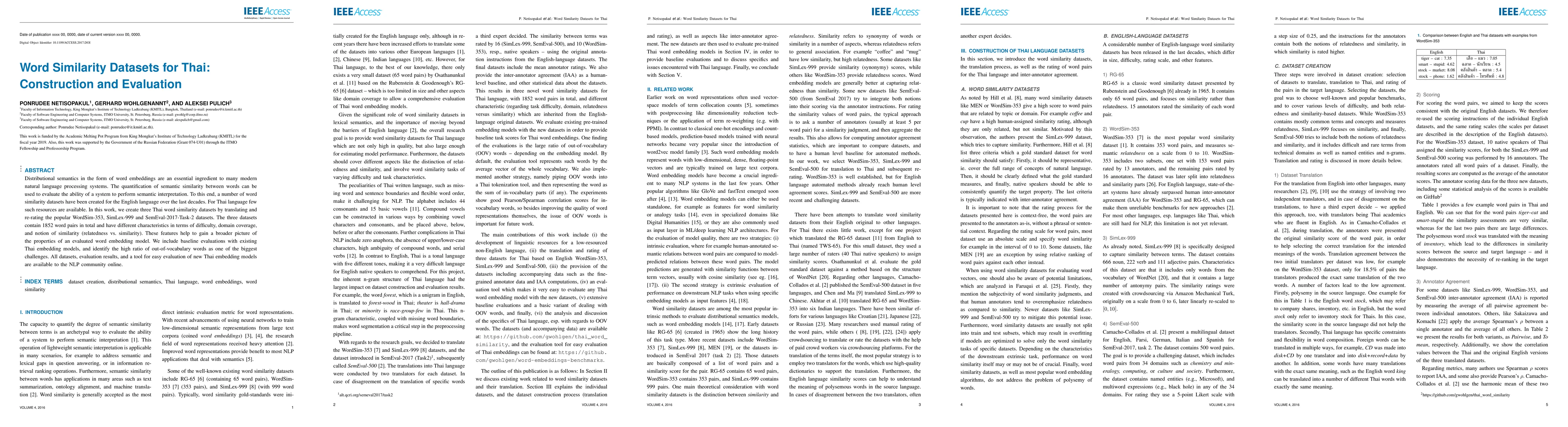 This paper constructs three new Thai word similarity datasets by adapting existing English datasets, aiming to evaluate Thai word embeddings. The datasets highlight challenges like high out-of-vocabulary word ratios and offer tools for future NLP research.