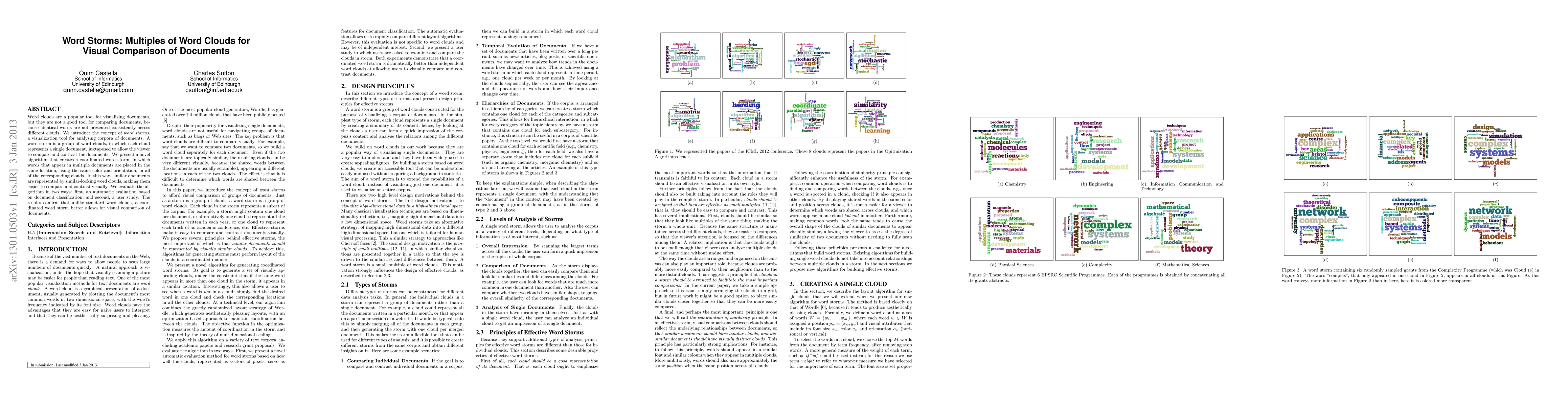 The paper introduces "word storms," a visualization technique that groups multiple word clouds to facilitate document comparison. The method uses a coordinated algorithm to align identical words across clouds, enabling better visual analysis and comparison of documents. Evaluations show that word storms outperform standard word clouds in document comparison tasks.